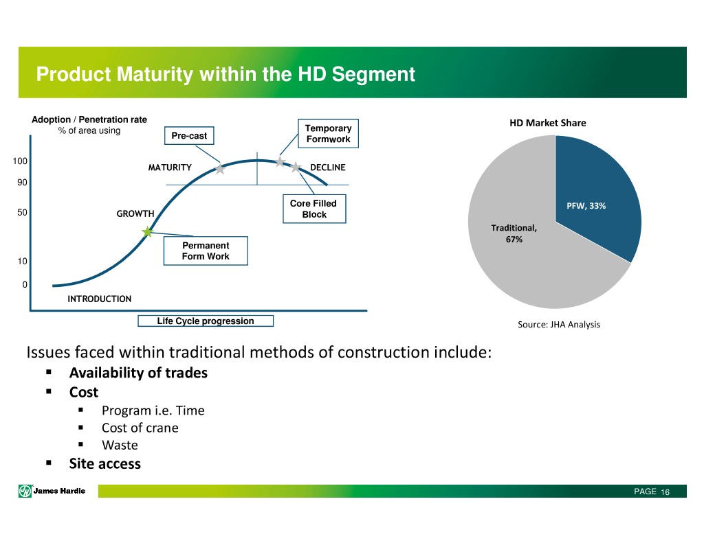 Product Maturity within the HD Segment Adoption / Penetration rate HD Market Share % of area using Temporary Pre-cast Formwork 100 MATURITY DECLINE 90 Core Filled PFW, 33% 50 GROWTH Block Traditional, 67% Permanent Form Work 10 0 INTRODUCTION Life Cycle progression Source: JHA Analysis Issues faced within traditional methods of construction include: Availability of trades Cost Program i.e. Time Cost of crane Waste Site access PAGE 16