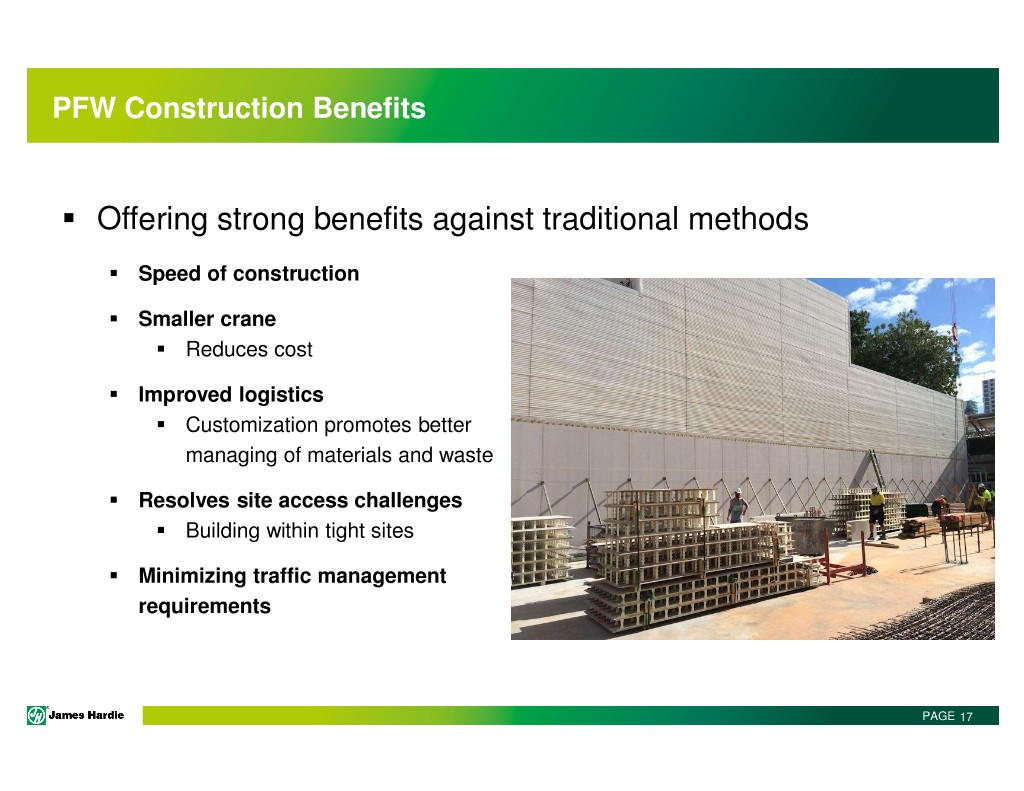 PFW Construction Benefits Offering strong benefits against traditional methods Speed of construction Smaller crane Reduces cost Improved logistics Customization promotes better managing of materials and waste Resolves site access challenges Building within tight sites Minimizing traffic management requirements PAGE 17
