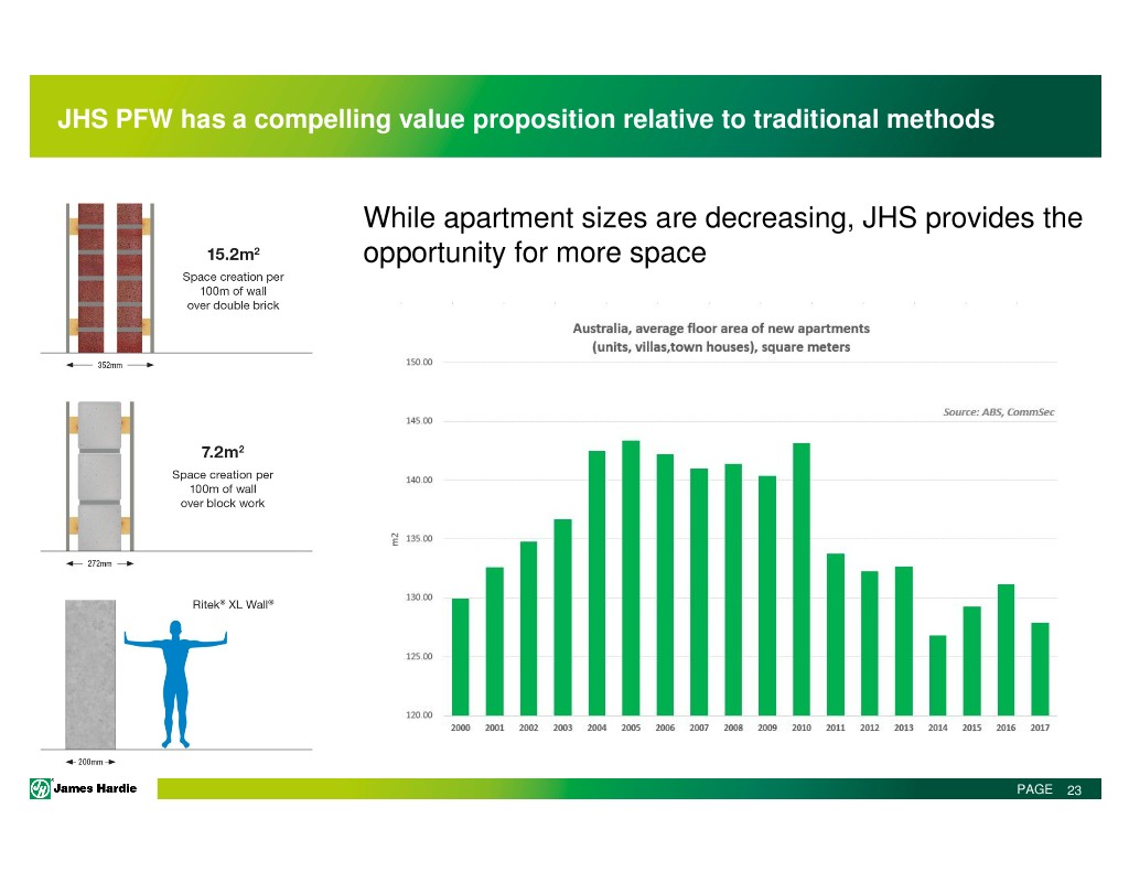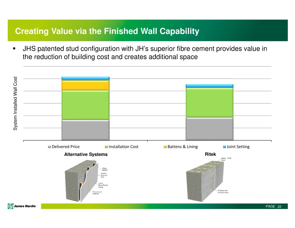Creating Value via the Finished Wall Capability JHS patented stud configuration with JH’s superior fibre cement provides value in the reduction of building cost and creates additional space System Installed Wall Cost Wall Installed System Delivered Price Installation Cost Battens & Lining Joint Setting Alternative Systems Ritek PAGE 22