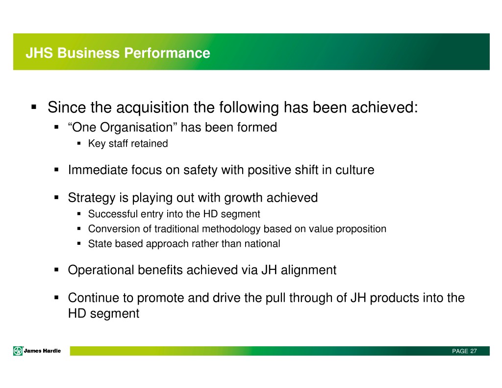 JHS Business Performance Since the acquisition the following has been achieved: “One Organisation” has been formed Key staff retained Immediate focus on safety with positive shift in culture Strategy is playing out with growth achieved Successful entry into the HD segment Conversion of traditional methodology based on value proposition State based approach rather than national Operational benefits achieved via JH alignment Continue to promote and drive the pull through of JH products into the HD segment PAGE 27