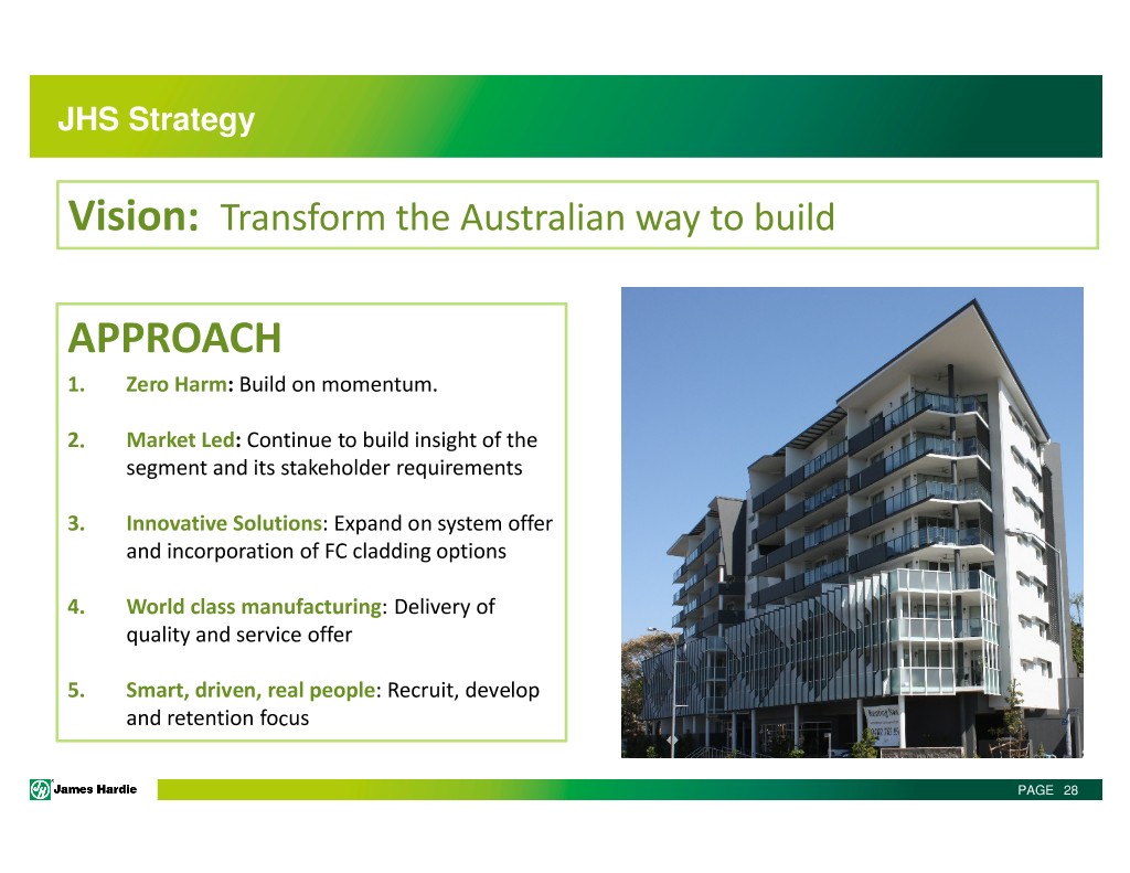 JHS Strategy Vision: Transform the Australian way to build APPROACH 1. Zero Harm : Build on momentum. 2. Market Led : Continue to build insight of the segment and its stakeholder requirements 3. Innovative Solutions : Expand on system offer and incorporation of FC cladding options 4. World class manufacturing : Delivery of quality and service offer 5. Smart, driven, real people : Recruit, develop and retention focus PAGE 28