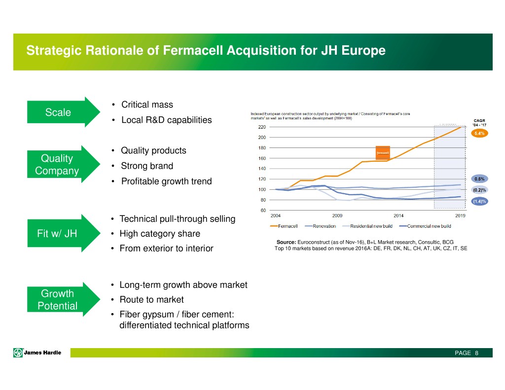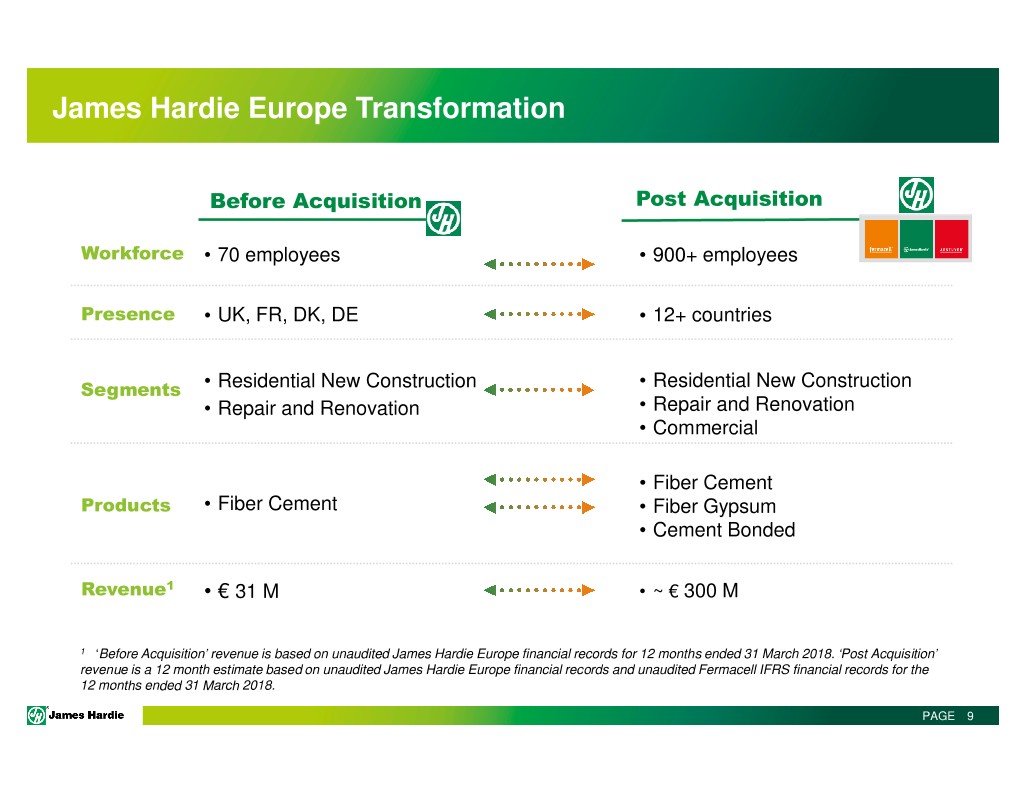 Strategic Rationale of Fermacell Acquisition for JH Europe • Critical mass Scale • Local R&D capabilities • Quality products Quality Company • Strong brand • Profitable growth trend • Technical pull-through selling Fit w/ JH • High category share Source: Euroconstruct (as of Nov-16), B+L Market research, Consultic, BCG • From exterior to interior Top 10 markets based on revenue 2016A: DE, FR, DK, NL, CH, AT, UK, CZ, IT, SE • Long-term growth above market Growth • Route to market Potential • Fiber gypsum / fiber cement: differentiated technical platforms PAGE 8