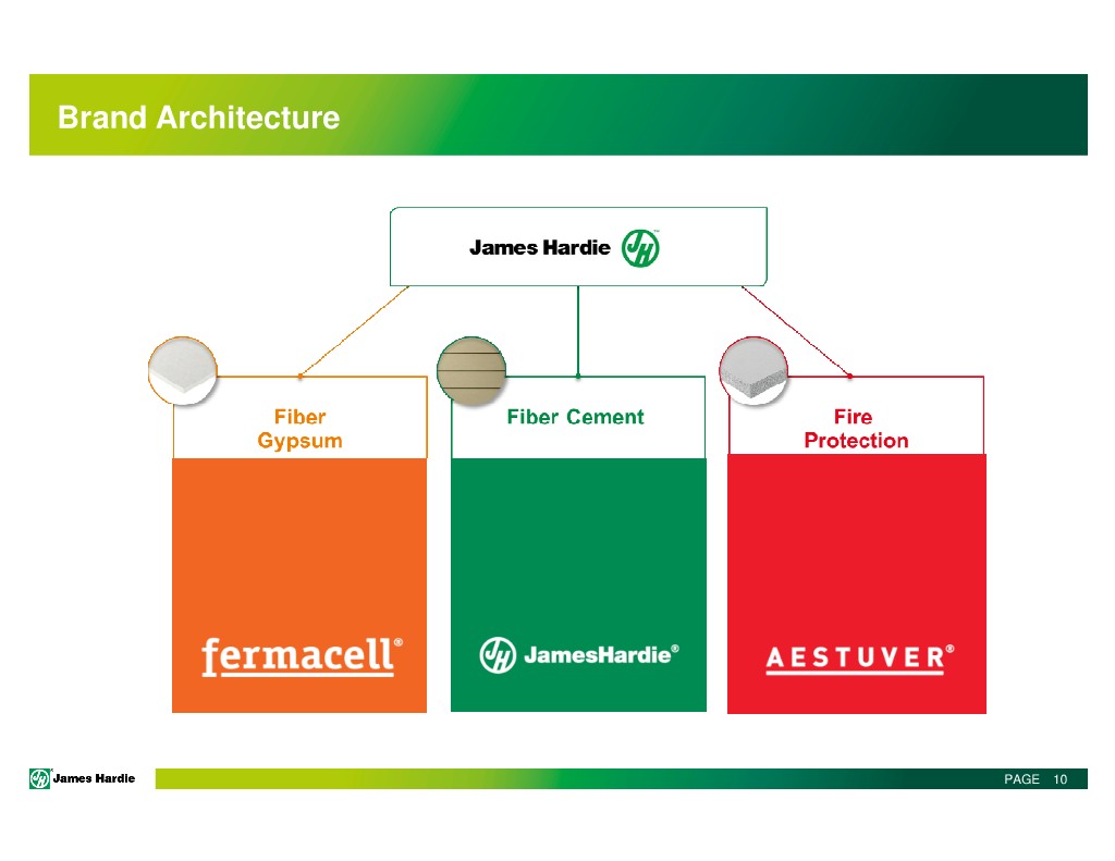 James Hardie Europe Transformation Before Acquisition Post Acquisition Workforce • 70 employees • 900+ employees Presence • UK, FR, DK, DE • 12+ countries Segments • Residential New Construction • Residential New Construction • Repair and Renovation • Repair and Renovation • Commercial • Fiber Cement Products • Fiber Cement • Fiber Gypsum • Cement Bonded Revenue 1 • € 31 M • ~ € 300 M 1 ‘Before Acquisition’ revenue is based on unaudited James Hardie Europe financial records for 12 months ended 31 March 2018. ‘Post Acquisition’ revenue is a 12 month estimate based on unaudited James Hardie Europe financial records and unaudited Fermacell IFRS financial records for the 12 months ended 31 March 2018. PAGE 9