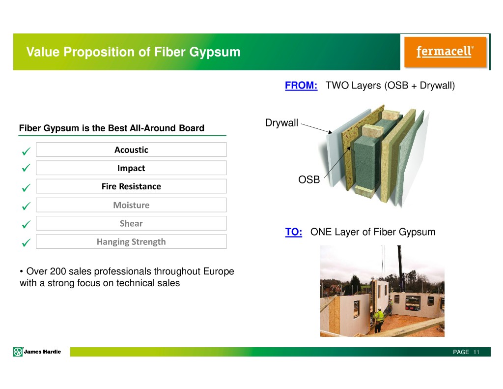 Value Proposition of Fiber Gypsum FROM: TWO Layers (OSB + Drywall) Drywall Fiber Gypsum is the Best All-Around Board Acoustic Impact OSB Fire Resistance Moisture Shear TO: ONE Layer of Fiber Gypsum Hanging Strength • Over 200 sales professionals throughout Europe with a strong focus on technical sales PAGE 11