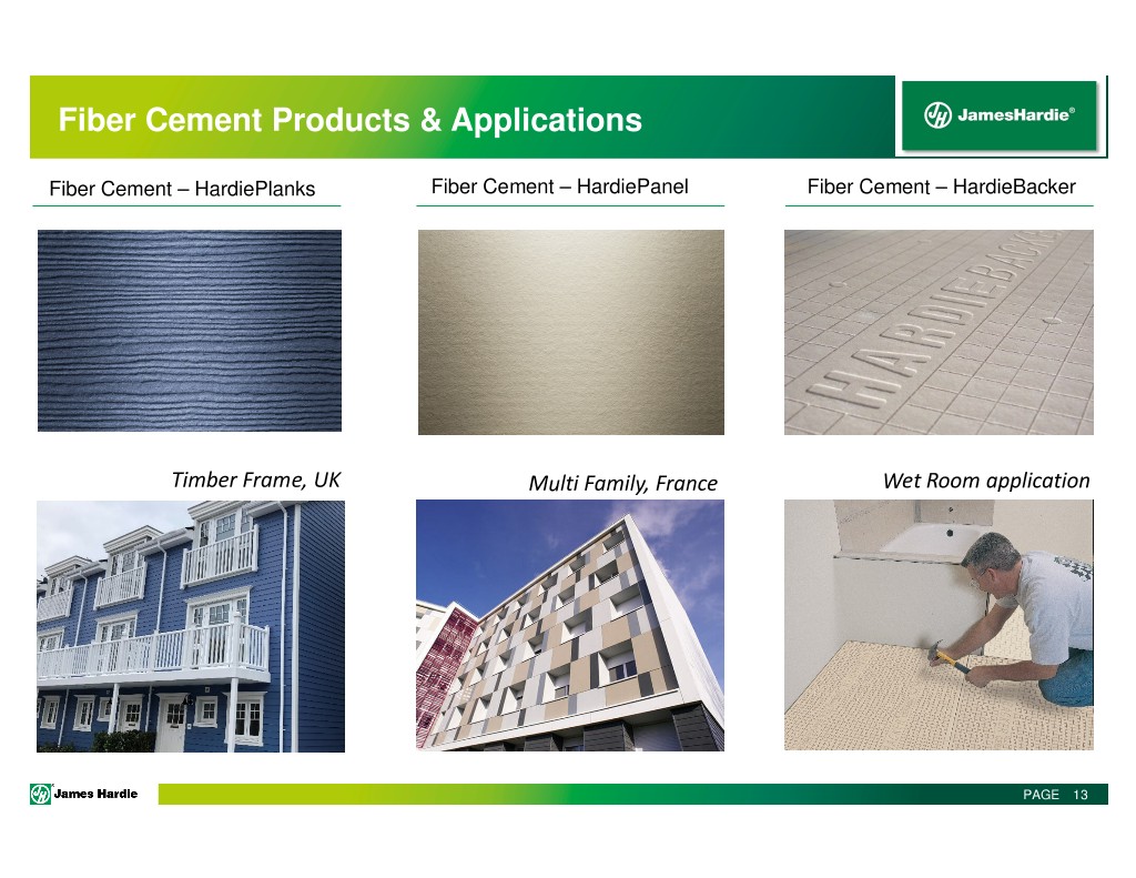 Fiber Cement Products & Applications Fiber Cement – HardiePlanks Fiber Cement – HardiePanel Fiber Cement – HardieBacker Timber Frame, UK Multi Family, France Wet Room application PAGE 13