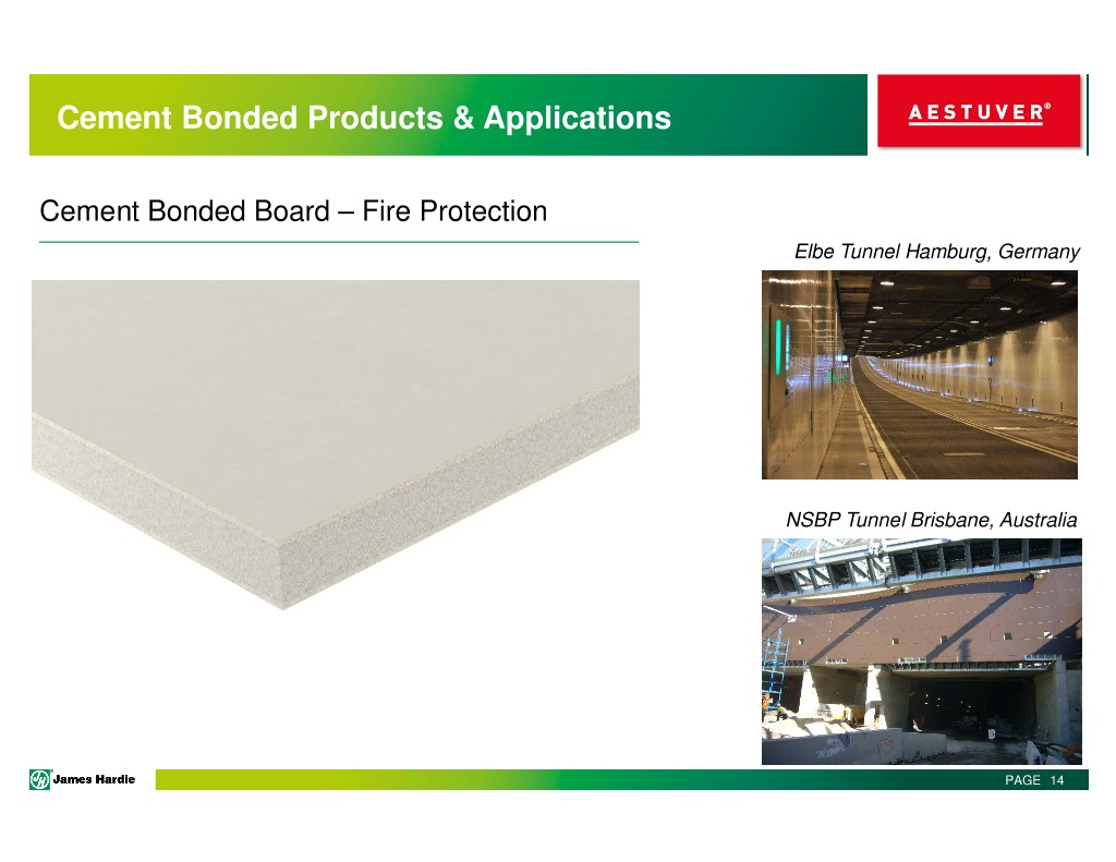 Cement Bonded Products & Applications Cement Bonded Board – Fire Protection Elbe Tunnel Hamburg, Germany NSBP Tunnel Brisbane, Australia 14 PAGE 14