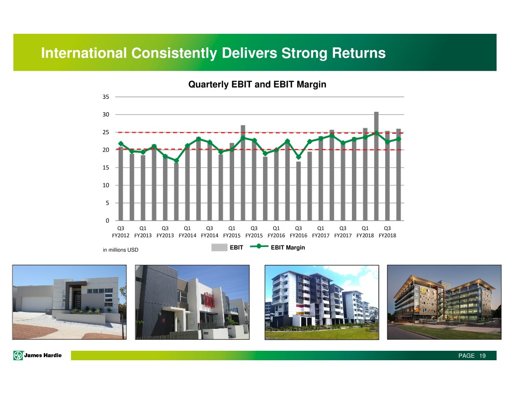 James Hardie Asia Pacific ZERO HARM AT THE CORE OF OUR STRATEGY Australia • Continue to grow above market with strong focus on demand generation, new product launches, and operational excellence New Zealand • Continue to gain share with focus on demand generation and operational excellence Philippines • Accelerated growth through repair & renovation and residential new construction segments • Successful start up of new production line in Cabuyao JH Systems • Focused growth on medium density and high density multi- family new construction PAGE 18