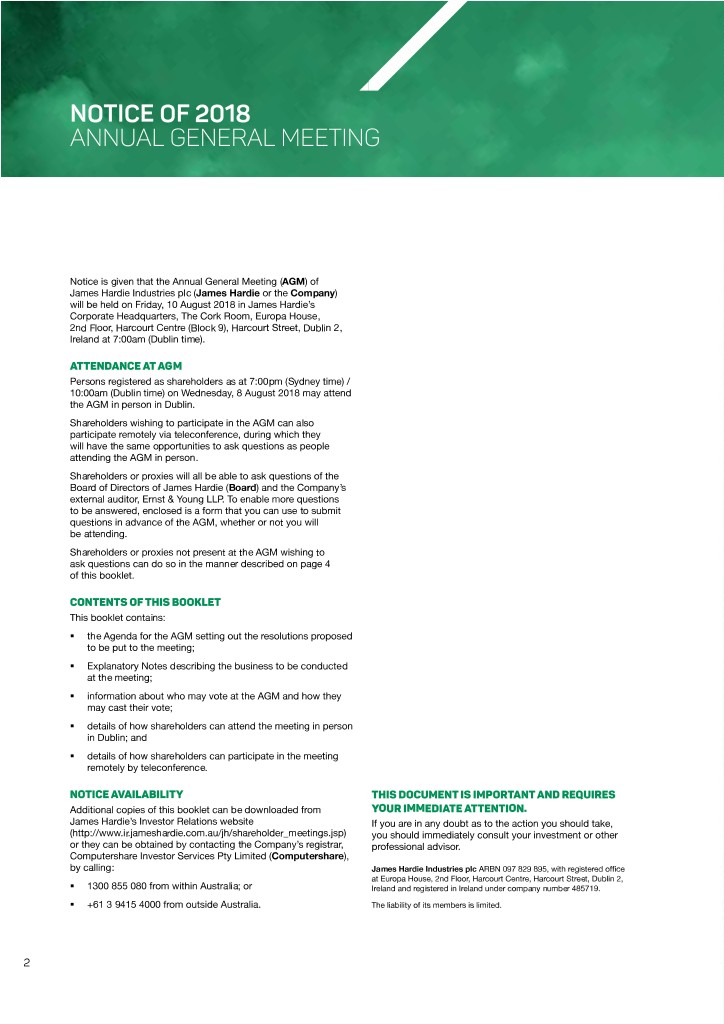 NOTICE OF 2018 ANNUAL GENERAL MEETING Notice is given that the Annual General Meeting (AGM) of James Hardie Industries plc (James Hardie or the Company) will be held on Friday, 10 August 2018 in James Hardie’s Corporate Headquarters, The Cork Room, Europa House, 2nd Floor, Harcourt Centre (Block 9), Harcourt Street, Dublin 2, Ireland at 7:00am (Dublin time). ATTENDANCE AT AGM Persons registered as shareholders as at 7:00pm (Sydney time) / 10:00am (Dublin time) on Wednesday, 8 August 2018 may attend the AGM in person in Dublin. Shareholders wishing to participate in the AGM can also participate remotely via teleconference, during which they will have the same opportunities to ask questions as people attending the AGM in person. Shareholders or proxies will all be able to ask questions of the Board of Directors of James Hardie (Board) and the Company’s external auditor, Ernst & Young LLP. To enable more questions to be answered, enclosed is a form that you can use to submit questions in advance of the AGM, whether or not you will be attending. Shareholders or proxies not present at the AGM wishing to ask questions can do so in the manner described on page 4 of this booklet. CONTENTS OF THIS BOOKLET This booklet contains: §§ the Agenda for the AGM setting out the resolutions proposed to be put to the meeting; §§ Explanatory Notes describing the business to be conducted at the meeting; §§ information about who may vote at the AGM and how they may cast their vote; §§ details of how shareholders can attend the meeting in person in Dublin; and §§ details of how shareholders can participate in the meeting remotely by teleconference. NOTICE AVAILABILITY THIS DOCUMENT IS IMPORTANT AND REQUIRES Additional copies of this booklet can be downloaded from YOUR IMMEDIATE ATTENTION. James Hardie’s Investor Relations website If you are in any doubt as to the action you should take, (http://www.ir.jameshardie.com.au/jh/shareholder_meetings.jsp) you should immediately consult your investment or other or they can be obtained by contacting the Company’s registrar, professional advisor. Computershare Investor Services Pty Limited (Computershare), by calling: James Hardie Industries plc ARBN 097 829 895, with registered office at Europa House, 2nd Floor, Harcourt Centre, Harcourt Street, Dublin 2, §§ 1300 855 080 from within Australia; or Ireland and registered in Ireland under company number 485719. §§ +61 3 9415 4000 from outside Australia. The liability of its members is limited. 2
