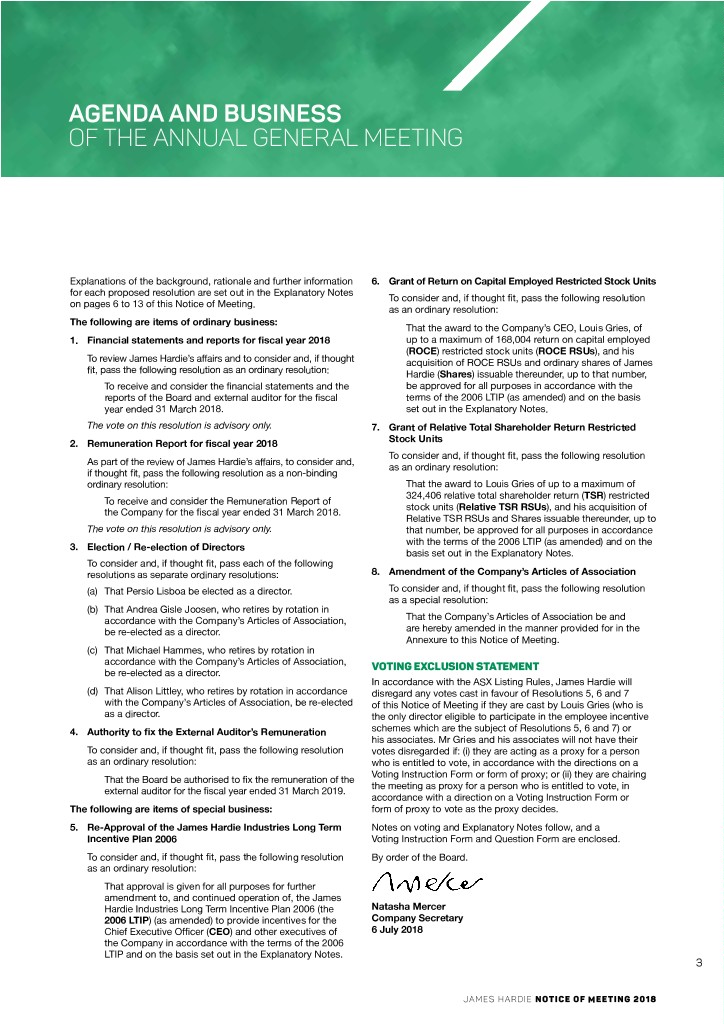 AGENDA AND BUSINESS OF THE ANNUAL GENERAL MEETING Explanations of the background, rationale and further information 6. Grant of Return on Capital Employed Restricted Stock Units for each proposed resolution are set out in the Explanatory Notes To consider and, if thought fit, pass the following resolution on pages 6 to 13 of this Notice of Meeting. as an ordinary resolution: The following are items of ordinary business: That the award to the Company’s CEO, Louis Gries, of 1. Financial statements and reports for fiscal year 2018 up to a maximum of 168,004 return on capital employed (ROCE) restricted stock units (ROCE RSUs), and his To review James Hardie’s affairs and to consider and, if thought acquisition of ROCE RSUs and ordinary shares of James fit, pass the following resolution as an ordinary resolution: Hardie (Shares) issuable thereunder, up to that number, To receive and consider the financial statements and the be approved for all purposes in accordance with the reports of the Board and external auditor for the fiscal terms of the 2006 LTIP (as amended) and on the basis year ended 31 March 2018. set out in the Explanatory Notes. The vote on this resolution is advisory only. 7. Grant of Relative Total Shareholder Return Restricted 2. Remuneration Report for fiscal year 2018 Stock Units To consider and, if thought fit, pass the following resolution As part of the review of James Hardie’s affairs, to consider and, as an ordinary resolution: if thought fit, pass the following resolution as a non‑binding ordinary resolution: That the award to Louis Gries of up to a maximum of 324,406 relative total shareholder return (TSR) restricted To receive and consider the Remuneration Report of stock units (Relative TSR RSUs), and his acquisition of the Company for the fiscal year ended 31 March 2018. Relative TSR RSUs and Shares issuable thereunder, up to The vote on this resolution is advisory only. that number, be approved for all purposes in accordance with the terms of the 2006 LTIP (as amended) and on the 3. Election / Re-election of Directors basis set out in the Explanatory Notes. To consider and, if thought fit, pass each of the following resolutions as separate ordinary resolutions: 8. Amendment of the Company’s Articles of Association (a) That Persio Lisboa be elected as a director. To consider and, if thought fit, pass the following resolution as a special resolution: (b) That Andrea Gisle Joosen, who retires by rotation in accordance with the Company’s Articles of Association, That the Company’s Articles of Association be and be re-elected as a director. are hereby amended in the manner provided for in the Annexure to this Notice of Meeting. (c) That Michael Hammes, who retires by rotation in accordance with the Company’s Articles of Association, VOTING EXCLUSION STATEMENT be re-elected as a director. In accordance with the ASX Listing Rules, James Hardie will (d) That Alison Littley, who retires by rotation in accordance disregard any votes cast in favour of Resolutions 5, 6 and 7 with the Company’s Articles of Association, be re-elected of this Notice of Meeting if they are cast by Louis Gries (who is as a director. the only director eligible to participate in the employee incentive 4. Authority to fix the External Auditor’s Remuneration schemes which are the subject of Resolutions 5, 6 and 7) or his associates. Mr Gries and his associates will not have their To consider and, if thought fit, pass the following resolution votes disregarded if: (i) they are acting as a proxy for a person as an ordinary resolution: who is entitled to vote, in accordance with the directions on a Voting Instruction Form or form of proxy; or (ii) they are chairing That the Board be authorised to fix the remuneration of the the meeting as proxy for a person who is entitled to vote, in external auditor for the fiscal year ended 31 March 2019. accordance with a direction on a Voting Instruction Form or The following are items of special business: form of proxy to vote as the proxy decides. 5. Re-Approval of the James Hardie Industries Long Term Notes on voting and Explanatory Notes follow, and a Incentive Plan 2006 Voting Instruction Form and Question Form are enclosed. To consider and, if thought fit, pass the following resolution By order of the Board. as an ordinary resolution: That approval is given for all purposes for further amendment to, and continued operation of, the James Hardie Industries Long Term Incentive Plan 2006 (the Natasha Mercer 2006 LTIP) (as amended) to provide incentives for the Company Secretary Chief Executive Officer CEO( ) and other executives of 6 July 2018 the Company in accordance with the terms of the 2006 LTIP and on the basis set out in the Explanatory Notes. 3 JAMES HARDIE NOTICE OF MEETING 2018