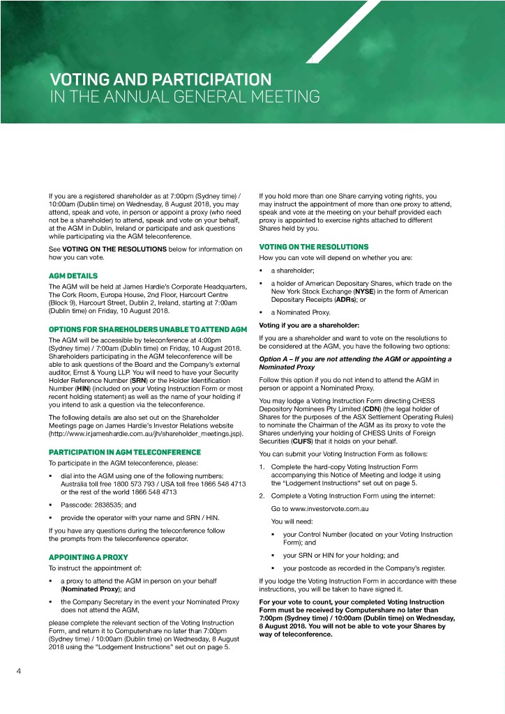 VOTING AND PARTICIPATION IN THE ANNUAL GENERAL MEETING If you are a registered shareholder as at 7:00pm (Sydney time) / If you hold more than one Share carrying voting rights, you 10:00am (Dublin time) on Wednesday, 8 August 2018, you may may instruct the appointment of more than one proxy to attend, attend, speak and vote, in person or appoint a proxy (who need speak and vote at the meeting on your behalf provided each not be a shareholder) to attend, speak and vote on your behalf, proxy is appointed to exercise rights attached to different at the AGM in Dublin, Ireland or participate and ask questions Shares held by you. while participating via the AGM teleconference. See VOTING ON THE RESOLUTIONS below for information on VOTING ON THE RESOLUTIONS how you can vote. How you can vote will depend on whether you are: §§ a shareholder; AGM DETAILS The AGM will be held at James Hardie’s Corporate Headquarters, §§ a holder of American Depositary Shares, which trade on the The Cork Room, Europa House, 2nd Floor, Harcourt Centre New York Stock Exchange (NYSE) in the form of American (Block 9), Harcourt Street, Dublin 2, Ireland, starting at 7:00am Depositary Receipts (ADRs); or (Dublin time) on Friday, 10 August 2018. §§ a Nominated Proxy. Voting if you are a shareholder: OPTIONS FOR SHAREHOLDERS UNABLE TO ATTEND AGM The AGM will be accessible by teleconference at 4:00pm If you are a shareholder and want to vote on the resolutions to (Sydney time) / 7:00am (Dublin time) on Friday, 10 August 2018. be considered at the AGM, you have the following two options: Shareholders participating in the AGM teleconference will be Option A – If you are not attending the AGM or appointing a able to ask questions of the Board and the Company’s external Nominated Proxy auditor, Ernst & Young LLP. You will need to have your Security Holder Reference Number (SRN) or the Holder Identification Follow this option if you do not intend to attend the AGM in Number (HIN) (included on your Voting Instruction Form or most person or appoint a Nominated Proxy. recent holding statement) as well as the name of your holding if You may lodge a Voting Instruction Form directing CHESS you intend to ask a question via the teleconference. Depository Nominees Pty Limited (CDN) (the legal holder of The following details are also set out on the Shareholder Shares for the purposes of the ASX Settlement Operating Rules) Meetings page on James Hardie’s Investor Relations website to nominate the Chairman of the AGM as its proxy to vote the (http://www.ir.jameshardie.com.au/jh/shareholder_meetings.jsp). Shares underlying your holding of CHESS Units of Foreign Securities (CUFS) that it holds on your behalf. PARTICIPATION IN AGM TELECONFERENCE You can submit your Voting Instruction Form as follows: To participate in the AGM teleconference, please: 1. Complete the hard-copy Voting Instruction Form §§ dial into the AGM using one of the following numbers: accompanying this Notice of Meeting and lodge it using Australia toll free 1800 573 793 / USA toll free 1866 548 4713 the “Lodgement Instructions” set out on page 5. or the rest of the world 1866 548 4713 2. Complete a Voting Instruction Form using the internet: §§ Passcode: 2838535; and Go to www.investorvote.com.au §§ provide the operator with your name and SRN / HIN. You will need: If you have any questions during the teleconference follow §§ your Control Number (located on your Voting Instruction the prompts from the teleconference operator. Form); and APPOINTING A PROXY §§ your SRN or HIN for your holding; and To instruct the appointment of: §§ your postcode as recorded in the Company’s register. §§ a proxy to attend the AGM in person on your behalf If you lodge the Voting Instruction Form in accordance with these (Nominated Proxy); and instructions, you will be taken to have signed it. §§ the Company Secretary in the event your Nominated Proxy For your vote to count, your completed Voting Instruction does not attend the AGM, Form must be received by Computershare no later than 7:00pm (Sydney time) / 10:00am (Dublin time) on Wednesday, please complete the relevant section of the Voting Instruction 8 August 2018. You will not be able to vote your Shares by Form, and return it to Computershare no later than 7:00pm way of teleconference. (Sydney time) / 10:00am (Dublin time) on Wednesday, 8 August 2018 using the “Lodgement Instructions” set out on page 5. 4