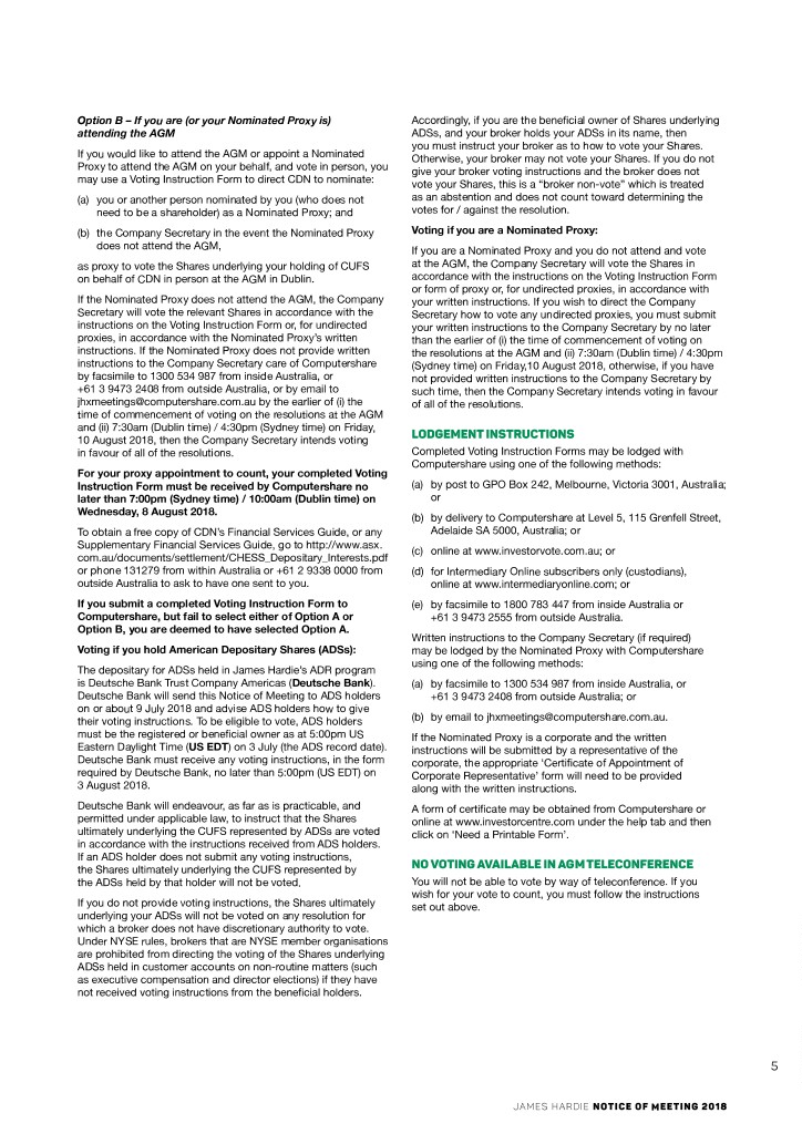 Option B – If you are (or your Nominated Proxy is) Accordingly, if you are the beneficial owner of Shares underlying attending the AGM ADSs, and your broker holds your ADSs in its name, then you must instruct your broker as to how to vote your Shares. If you would like to attend the AGM or appoint a Nominated Otherwise, your broker may not vote your Shares. If you do not Proxy to attend the AGM on your behalf, and vote in person, you give your broker voting instructions and the broker does not may use a Voting Instruction Form to direct CDN to nominate: vote your Shares, this is a “broker non-vote” which is treated (a) you or another person nominated by you (who does not as an abstention and does not count toward determining the need to be a shareholder) as a Nominated Proxy; and votes for / against the resolution. (b) the Company Secretary in the event the Nominated Proxy Voting if you are a Nominated Proxy: does not attend the AGM, If you are a Nominated Proxy and you do not attend and vote as proxy to vote the Shares underlying your holding of CUFS at the AGM, the Company Secretary will vote the Shares in on behalf of CDN in person at the AGM in Dublin. accordance with the instructions on the Voting Instruction Form or form of proxy or, for undirected proxies, in accordance with If the Nominated Proxy does not attend the AGM, the Company your written instructions. If you wish to direct the Company Secretary will vote the relevant Shares in accordance with the Secretary how to vote any undirected proxies, you must submit instructions on the Voting Instruction Form or, for undirected your written instructions to the Company Secretary by no later proxies, in accordance with the Nominated Proxy’s written than the earlier of (i) the time of commencement of voting on instructions. If the Nominated Proxy does not provide written the resolutions at the AGM and (ii) 7:30am (Dublin time) / 4:30pm instructions to the Company Secretary care of Computershare (Sydney time) on Friday,10 August 2018, otherwise, if you have by facsimile to 1300 534 987 from inside Australia, or not provided written instructions to the Company Secretary by +61 3 9473 2408 from outside Australia, or by email to such time, then the Company Secretary intends voting in favour [email protected] by the earlier of (i) the of all of the resolutions. time of commencement of voting on the resolutions at the AGM and (ii) 7:30am (Dublin time) / 4:30pm (Sydney time) on Friday, 10 August 2018, then the Company Secretary intends voting LODGEMENT INSTRUCTIONS in favour of all of the resolutions. Completed Voting Instruction Forms may be lodged with Computershare using one of the following methods: For your proxy appointment to count, your completed Voting Instruction Form must be received by Computershare no (a) by post to GPO Box 242, Melbourne, Victoria 3001, Australia; later than 7:00pm (Sydney time) / 10:00am (Dublin time) on or Wednesday, 8 August 2018. (b) by delivery to Computershare at Level 5, 115 Grenfell Street, To obtain a free copy of CDN’s Financial Services Guide, or any Adelaide SA 5000, Australia; or Supplementary Financial Services Guide, go to http://www.asx. (c) online at www.investorvote.com.au; or com.au/documents/settlement/CHESS_Depositary_Interests.pdf or phone 131279 from within Australia or +61 2 9338 0000 from (d) for Intermediary Online subscribers only (custodians), outside Australia to ask to have one sent to you. online at www.intermediaryonline.com; or If you submit a completed Voting Instruction Form to (e) by facsimile to 1800 783 447 from inside Australia or Computershare, but fail to select either of Option A or +61 3 9473 2555 from outside Australia. Option B, you are deemed to have selected Option A. Written instructions to the Company Secretary (if required) Voting if you hold American Depositary Shares (ADSs): may be lodged by the Nominated Proxy with Computershare using one of the following methods: The depositary for ADSs held in James Hardie’s ADR program is Deutsche Bank Trust Company Americas (Deutsche Bank). (a) by facsimile to 1300 534 987 from inside Australia, or Deutsche Bank will send this Notice of Meeting to ADS holders +61 3 9473 2408 from outside Australia; or on or about 9 July 2018 and advise ADS holders how to give their voting instructions. To be eligible to vote, ADS holders (b) by email to [email protected]. must be the registered or beneficial owner as at 5:00pm US If the Nominated Proxy is a corporate and the written Eastern Daylight Time (US EDT) on 3 July (the ADS record date). instructions will be submitted by a representative of the Deutsche Bank must receive any voting instructions, in the form corporate, the appropriate ‘Certificate of Appointment of required by Deutsche Bank, no later than 5:00pm (US EDT) on Corporate Representative’ form will need to be provided 3 August 2018. along with the written instructions. Deutsche Bank will endeavour, as far as is practicable, and A form of certificate may be obtained from Computershare or permitted under applicable law, to instruct that the Shares online at www.investorcentre.com under the help tab and then ultimately underlying the CUFS represented by ADSs are voted click on ‘Need a Printable Form’. in accordance with the instructions received from ADS holders. If an ADS holder does not submit any voting instructions, the Shares ultimately underlying the CUFS represented by NO VOTING AVAILABLE IN AGM TELECONFERENCE the ADSs held by that holder will not be voted. You will not be able to vote by way of teleconference. If you wish for your vote to count, you must follow the instructions If you do not provide voting instructions, the Shares ultimately set out above. underlying your ADSs will not be voted on any resolution for which a broker does not have discretionary authority to vote. Under NYSE rules, brokers that are NYSE member organisations are prohibited from directing the voting of the Shares unde