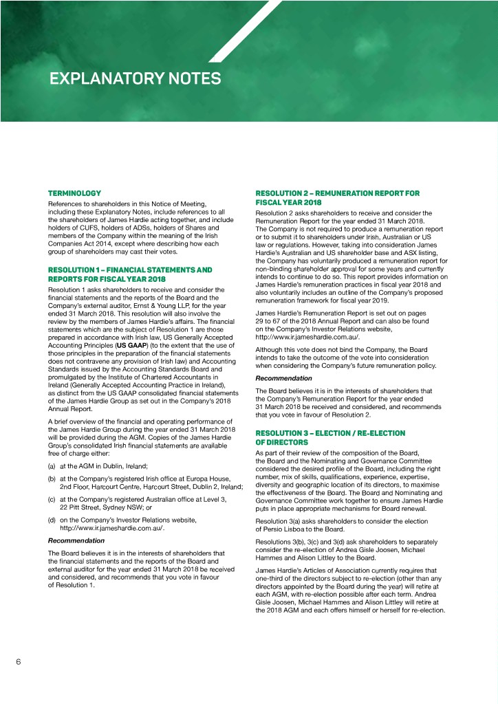 EXPLANATORY NOTES TERMINOLOGY RESOLUTION 2 – REMUNERATION REPORT FOR References to shareholders in this Notice of Meeting, FISCAL YEAR 2018 including these Explanatory Notes, include references to all Resolution 2 asks shareholders to receive and consider the the shareholders of James Hardie acting together, and include Remuneration Report for the year ended 31 March 2018. holders of CUFS, holders of ADSs, holders of Shares and The Company is not required to produce a remuneration report members of the Company within the meaning of the Irish or to submit it to shareholders under Irish, Australian or US Companies Act 2014, except where describing how each law or regulations. However, taking into consideration James group of shareholders may cast their votes. Hardie’s Australian and US shareholder base and ASX listing, the Company has voluntarily produced a remuneration report for RESOLUTION 1 – FINANCIAL STATEMENTS AND non-binding shareholder approval for some years and currently REPORTS FOR FISCAL YEAR 2018 intends to continue to do so. This report provides information on James Hardie’s remuneration practices in fiscal year 2018 and Resolution 1 asks shareholders to receive and consider the also voluntarily includes an outline of the Company’s proposed financial statements and the reports of the Board and the remuneration framework for fiscal year 2019. Company’s external auditor, Ernst & Young LLP, for the year ended 31 March 2018. This resolution will also involve the James Hardie’s Remuneration Report is set out on pages review by the members of James Hardie’s affairs. The financial 29 to 67 of the 2018 Annual Report and can also be found statements which are the subject of Resolution 1 are those on the Company’s Investor Relations website, prepared in accordance with Irish law, US Generally Accepted http://www.ir.jameshardie.com.au/. Accounting Principles (US GAAP) (to the extent that the use of Although this vote does not bind the Company, the Board those principles in the preparation of the financial statements intends to take the outcome of the vote into consideration does not contravene any provision of Irish law) and Accounting when considering the Company’s future remuneration policy. Standards issued by the Accounting Standards Board and promulgated by the Institute of Chartered Accountants in Recommendation Ireland (Generally Accepted Accounting Practice in Ireland), as distinct from the US GAAP consolidated financial statements The Board believes it is in the interests of shareholders that of the James Hardie Group as set out in the Company’s 2018 the Company’s Remuneration Report for the year ended Annual Report. 31 March 2018 be received and considered, and recommends that you vote in favour of Resolution 2. A brief overview of the financial and operating performance of the James Hardie Group during the year ended 31 March 2018 RESOLUTION 3 – ELECTION / RE-ELECTION will be provided during the AGM. Copies of the James Hardie Group’s consolidated Irish financial statements are available OF DIRECTORS free of charge either: As part of their review of the composition of the Board, the Board and the Nominating and Governance Committee (a) at the AGM in Dublin, Ireland; considered the desired profile of the Board, including the right (b) at the Company’s registered Irish office at Europa House, number, mix of skills, qualifications, experience, expertise, 2nd Floor, Harcourt Centre, Harcourt Street, Dublin 2, Ireland; diversity and geographic location of its directors, to maximise the effectiveness of the Board. The Board and Nominating and (c) at the Company’s registered Australian office at Level 3, Governance Committee work together to ensure James Hardie 22 Pitt Street, Sydney NSW; or puts in place appropriate mechanisms for Board renewal. (d) on the Company’s Investor Relations website, Resolution 3(a) asks shareholders to consider the election http://www.ir.jameshardie.com.au/. of Persio Lisboa to the Board. Recommendation Resolutions 3(b), 3(c) and 3(d) ask shareholders to separately consider the re-election of Andrea Gisle Joosen, Michael The Board believes it is in the interests of shareholders that Hammes and Alison Littley to the Board. the financial statements and the reports of the Board and external auditor for the year ended 31 March 2018 be received James Hardie’s Articles of Association currently requires that and considered, and recommends that you vote in favour one-third of the directors subject to re-election (other than any of Resolution 1. directors appointed by the Board during the year) will retire at each AGM, with re-election possible after each term. Andrea Gisle Joosen, Michael Hammes and Alison Littley will retire at the 2018 AGM and each offers himself or herself for re-election. 6