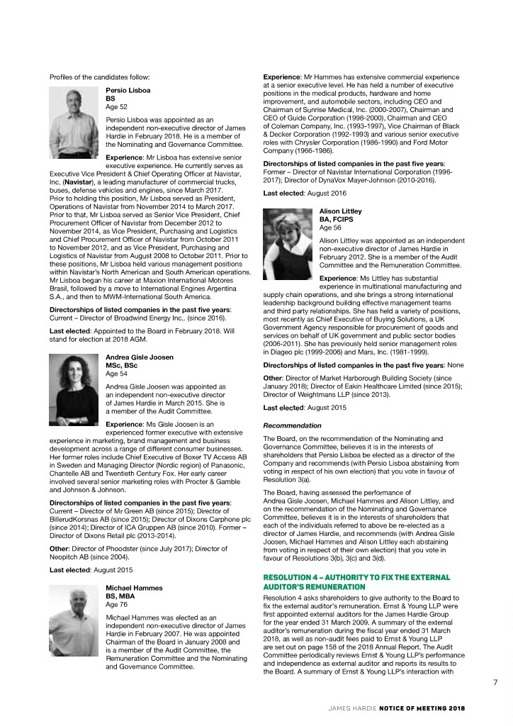 Profiles of the candidates follow: Experience: Mr Hammes has extensive commercial experience at a senior executive level. He has held a number of executive Persio Lisboa positions in the medical products, hardware and home BS improvement, and automobile sectors, including CEO and Age 52 Chairman of Sunrise Medical, Inc. (2000-2007), Chairman and Persio Lisboa was appointed as an CEO of Guide Corporation (1998-2000), Chairman and CEO independent non-executive director of James of Coleman Company, Inc. (1993-1997), Vice Chairman of Black Hardie in February 2018. He is a member of & Decker Corporation (1992-1993) and various senior executive the Nominating and Governance Committee. roles with Chrysler Corporation (1986-1990) and Ford Motor Company (1966-1986). Experience: Mr Lisboa has extensive senior executive experience. He currently serves as Directorships of listed companies in the past five years: Executive Vice President & Chief Operating Officer at Navistar, Former – Director of Navistar International Corporation (1996- Inc. (Navistar), a leading manufacturer of commercial trucks, 2017); Director of DynaVox Mayer-Johnson (2010-2016). buses, defense vehicles and engines, since March 2017. Last elected: August 2016 Prior to holding this position, Mr Lisboa served as President, Operations of Navistar from November 2014 to March 2017. Alison Littley Prior to that, Mr Lisboa served as Senior Vice President, Chief BA, FCIPS Procurement Officer of Navistar from December 2012 to Age 56 November 2014, as Vice President, Purchasing and Logistics and Chief Procurement Officer of Navistar from October 2011 Alison Littley was appointed as an independent to November 2012, and as Vice President, Purchasing and non-executive director of James Hardie in Logistics of Navistar from August 2008 to October 2011. Prior to February 2012. She is a member of the Audit these positions, Mr Lisboa held various management positions Committee and the Remuneration Committee. within Navistar’s North American and South American operations. Mr Lisboa began his career at Maxion International Motores Experience: Ms Littley has substantial Brasil, followed by a move to International Engines Argentina experience in multinational manufacturing and S.A., and then to MWM-International South America. supply chain operations, and she brings a strong international leadership background building effective management teams Directorships of listed companies in the past five years: and third party relationships. She has held a variety of positions, Current – Director of Broadwind Energy Inc,. (since 2016). most recently as Chief Executive of Buying Solutions, a UK Government Agency responsible for procurement of goods and Last elected: Appointed to the Board in February 2018. Will services on behalf of UK government and public sector bodies stand for election at 2018 AGM. (2006-2011). She has previously held senior management roles in Diageo plc (1999-2006) and Mars, Inc. (1981-1999). Andrea Gisle Joosen MSc, BSc Directorships of listed companies in the past five years: None Age 54 Other: Director of Market Harborough Building Society (since Andrea Gisle Joosen was appointed as January 2018); Director of Eakin Healthcare Limited (since 2015); an independent non-executive director Director of Weightmans LLP (since 2013). of James Hardie in March 2015. She is Last elected: August 2015 a member of the Audit Committee. Experience: Ms Gisle Joosen is an Recommendation experienced former executive with extensive experience in marketing, brand management and business The Board, on the recommendation of the Nominating and development across a range of different consumer businesses. Governance Committee, believes it is in the interests of Her former roles include Chief Executive of Boxer TV Access AB shareholders that Persio Lisboa be elected as a director of the in Sweden and Managing Director (Nordic region) of Panasonic, Company and recommends (with Persio Lisboa abstaining from Chantelle AB and Twentieth Century Fox. Her early career voting in respect of his own election) that you vote in favour of involved several senior marketing roles with Procter & Gamble Resolution 3(a). and Johnson & Johnson. The Board, having assessed the performance of Directorships of listed companies in the past five years: Andrea Gisle Joosen, Michael Hammes and Alison Littley, and Current – Director of Mr Green AB (since 2015); Director of on the recommendation of the Nominating and Governance BillerudKorsnas AB (since 2015); Director of Dixons Carphone plc Committee, believes it is in the interests of shareholders that (since 2014); Director of ICA Gruppen AB (since 2010). Former – each of the individuals referred to above be re-elected as a Director of Dixons Retail plc (2013-2014). director of James Hardie, and recommends (with Andrea Gisle Joosen, Michael Hammes and Alison Littley each abstaining Other: Director of Phoodster (since July 2017); Director of from voting in respect of their own election) that you vote in Neopitch AB (since 2004). favour of Resolutions 3(b), 3(c) and 3(d). Last elected: August 2015 RESOLUTION 4 – AUTHORITY TO FIX THE EXTERNAL Michael Hammes AUDITOR’S REMUNERATION BS, MBA Resolution 4 asks shareholders to give authority to the Board to Age 76 fix the external auditor’s remuneration. Ernst & Young LLP were Michael Hammes was elected as an first appointed external auditors for the James Hardie Group independent non-executive director of James for the year ended 31 March 2009. A summary of the external Hardie in February 2007. He was appointed auditor’s remuneration during the fiscal year ended 31 March Chairman of the Board in January 2008 and 2018, as well as non-audit fees paid to Ernst & Young LLP is a member of the Audit Committee, the are set out on page 158 of the 2018 Annual Report. The Audit Remuneration Committee and the Nominating Committee periodically reviews Ernst & Young LLP’s performance and 