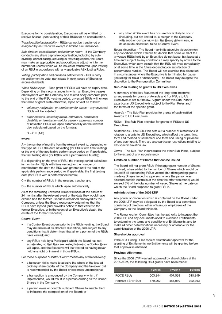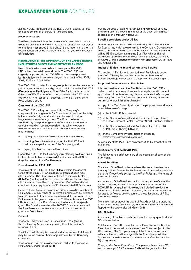EXPLANATORY NOTES CONTINUED James Hardie, the Board and the Board Committees is set out For the purpose of satisfying ASX Listing Rule requirements, on pages 80 and 81 of the 2018 Annual Report. the information disclosed in respect of the 2006 LTIP applies to Resolution 5 through 7 inclusive. Recommendation Specific provisions under US law The Board believes it is in the interests of shareholders that the Board be given authority to fix the external auditor’s remuneration US law contains specific provisions dealing with compensation for the fiscal year ended 31 March 2019 and recommends, on the for Executives, which are relevant to the Company. Consequently, recommendation of the Audit Committee that you vote in favour since a number of Participants in the 2006 LTIP have been and of Resolution 4. will be US Executives, a separate Sub-Plan with additional conditions applicable to US Executives is provided. Generally, RESOLUTION 5 – RE-APPROVAL OF THE JAMES HARDIE the 2006 LTIP is designed to comply with applicable US tax laws and regulations. INDUSTRIES LONG TERM INCENTIVE PLAN 2006 Resolution 5 asks shareholders to re-approve the 2006 Grants of Entitlements and performance hurdles LTIP, subject to certain amendments. The 2006 LTIP was The vesting of Entitlements granted to all Participants under originally approved at the 2006 AGM and was re-approved the 2006 LTIP may be conditional on the achievement of by shareholders with certain amendments at each of the 2008, performance hurdles set out in the terms of the specific grant. 2009, 2012 and 2015 AGMs. Proposed Amendments to Plan Rules The 2006 LTIP provides for a range of potential entitlements to be paid to executives who are eligible to participate in the 2006 LTIP It is proposed to amend the Plan Rules for the 2006 LTIP in (Executives or Participants). One of the Participants is Louis order to make necessary changes for compliance with current Gries, the CEO. The benefits to be provided to the CEO under applicable US tax laws and regulations, as a result of changes the 2006 LTIP in respect of fiscal year 2019 are the subject of emanating from the Tax Cuts and Jobs Act of 2017, as well as Resolutions 6 and 7. certain other administrative changes. Overview of the 2006 LTIP A copy of the Plan Rules highlighting the proposed amendments is available free of charge: The 2006 LTIP is a key component of the Company’s compensation arrangements for Executives. It provides flexibility (a) at the AGM in Dublin, Ireland; in the type of equity award which can be used to deliver (b) at the Company’s registered Irish office at Europa House, long-term shareholder alignment. The Board believes that 2nd Floor, Harcourt Centre, Harcourt Street, Dublin 2, Ireland; this flexibility is important given the Company’s international operations and will continue to allow it to tailor rewards to (c) at the Company’s registered Australian office at Level 3, Executives and maximise returns to shareholders over the 22 Pitt Street, Sydney NSW; or long‑term by: (d) on the Company’s Investor Relations website, §§ aligning the interests of Executives and shareholders; http://www.ir.jameshardie.com.au/. §§ matching Executive rewards under the 2006 LTIP with A summary of the Plan Rules as proposed to be amended is set the long-term performance of the Company; and out below. §§ helping to attract and retain Executives. Brief summary of each Sub-Plan Under the 2006 LTIP, the Company may offer eligible Executives The following is a brief summary of the operation of each of the both cash-settled awards (Awards) and stock-settled RSUs Sub-Plans. (together referred to as Entitlements). Award Sub-Plan Operation of the 2006 LTIP The Award Sub-Plan involves cash-settled awards rather than The rules of the 2006 LTIP (Plan Rules) explain the general the acquisition of securities by Executives. A grant of Awards to a terms of the 2006 LTIP which apply to grants of each type particular Executive is subject to the Plan Rules and the terms of of Entitlement. The Plan Rules include a separate sub-plan the specific grant. (Sub-Plan) setting out the terms and conditions for each type of Entitlement, as well as a separate Sub-Plan with additional As the Award Sub-Plan does not involve any issue of securities conditions that apply to offers of Entitlements to US Executives. by the Company, shareholder approval of this aspect of the 2006 LTIP is not required. However, it is included here for the Selected Executives will be granted either a specified number of information of shareholders. In general, the terms and conditions Entitlements, or a number of Entitlements calculated by reference for grants of Awards are the same as those for grants of RSUs to a US$ amount of long-term incentive and the fair value of the (described below). Entitlement to be granted. A grant of Entitlements under the 2006 LTIP is subject to the Plan Rules and the terms of the specific More information about the grant of Awards which are proposed grant. The Board administers the 2006 LTIP in accordance with to be made during fiscal year 2019 is set out in the Remuneration the Plan Rules and the terms and conditions of the specific Report for the year ended 31 March 2018. grants to Executives. RSU Sub-Plan General A summary of the terms and conditions that apply specifically to The term “Shares” as used in Resolutions 5 to 7 (and in RSUs is set below. the Explanatory Notes accompanying Resolutions 5 to 7) Entitlement – Each RSU granted to an Executive will entitle the includes CUFS. Executive to be issued or transferred one Share, subject to the The Shares which may be earned under the various Entitlements RSU vesting. The Company may put the Executive in contact may be issued as new Shares or purchased by the Company with a broker who will arrange with the Executive to sell the on-market. Shares and provide the cash proceeds on or after the date the RSU has vested. The Company will not prov