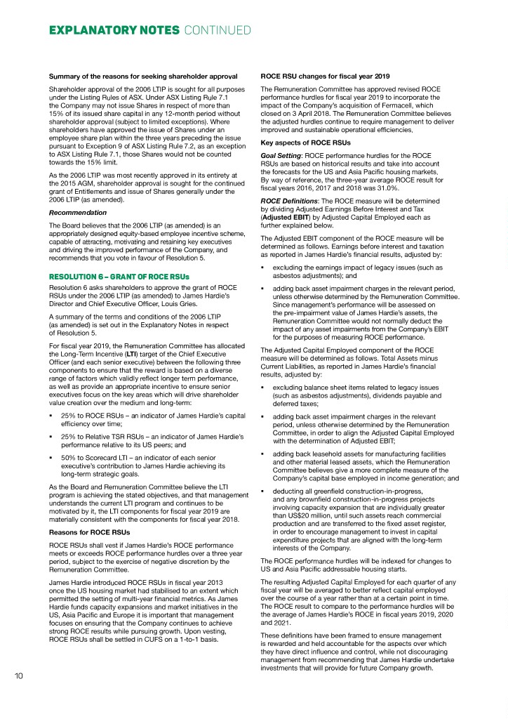 EXPLANATORY NOTES CONTINUED Summary of the reasons for seeking shareholder approval ROCE RSU changes for fiscal year 2019 Shareholder approval of the 2006 LTIP is sought for all purposes The Remuneration Committee has approved revised ROCE under the Listing Rules of ASX. Under ASX Listing Rule 7.1 performance hurdles for fiscal year 2019 to incorporate the the Company may not issue Shares in respect of more than impact of the Company’s acquisition of Fermacell, which 15% of its issued share capital in any 12-month period without closed on 3 April 2018. The Remuneration Committee believes shareholder approval (subject to limited exceptions). Where the adjusted hurdles continue to require management to deliver shareholders have approved the issue of Shares under an improved and sustainable operational efficiencies. employee share plan within the three years preceding the issue pursuant to Exception 9 of ASX Listing Rule 7.2, as an exception Key aspects of ROCE RSUs to ASX Listing Rule 7.1, those Shares would not be counted Goal Setting: ROCE performance hurdles for the ROCE towards the 15% limit. RSUs are based on historical results and take into account As the 2006 LTIP was most recently approved in its entirety at the forecasts for the US and Asia Pacific housing markets. the 2015 AGM, shareholder approval is sought for the continued By way of reference, the three-year average ROCE result for grant of Entitlements and issue of Shares generally under the fiscal years 2016, 2017 and 2018 was 31.0%. 2006 LTIP (as amended). ROCE Definitions: The ROCE measure will be determined Recommendation by dividing Adjusted Earnings Before Interest and Tax (Adjusted EBIT) by Adjusted Capital Employed each as The Board believes that the 2006 LTIP (as amended) is an further explained below. appropriately designed equity-based employee incentive scheme, capable of attracting, motivating and retaining key executives The Adjusted EBIT component of the ROCE measure will be and driving the improved performance of the Company, and determined as follows. Earnings before interest and taxation recommends that you vote in favour of Resolution 5. as reported in James Hardie’s financial results, adjusted by: §§ excluding the earnings impact of legacy issues (such as RESOLUTION 6 – GRANT OF ROCE RSUs asbestos adjustments); and Resolution 6 asks shareholders to approve the grant of ROCE §§ adding back asset impairment charges in the relevant period, RSUs under the 2006 LTIP (as amended) to James Hardie’s unless otherwise determined by the Remuneration Committee. Director and Chief Executive Officer, Louis Gries. Since management’s performance will be assessed on the pre‑impairment value of James Hardie’s assets, the A summary of the terms and conditions of the 2006 LTIP Remuneration Committee would not normally deduct the (as amended) is set out in the Explanatory Notes in respect impact of any asset impairments from the Company’s EBIT of Resolution 5. for the purposes of measuring ROCE performance. For fiscal year 2019, the Remuneration Committee has allocated The Adjusted Capital Employed component of the ROCE the Long-Term Incentive (LTI) target of the Chief Executive measure will be determined as follows. Total Assets minus Officer (and each senior executive) between the following three Current Liabilities, as reported in James Hardie’s financial components to ensure that the reward is based on a diverse results, adjusted by: range of factors which validly reflect longer term performance, as well as provide an appropriate incentive to ensure senior §§ excluding balance sheet items related to legacy issues executives focus on the key areas which will drive shareholder (such as asbestos adjustments), dividends payable and value creation over the medium and long-term: deferred taxes; §§ 25% to ROCE RSUs – an indicator of James Hardie’s capital §§ adding back asset impairment charges in the relevant efficiency over time; period, unless otherwise determined by the Remuneration Committee, in order to align the Adjusted Capital Employed §§ 25% to Relative TSR RSUs – an indicator of James Hardie’s with the determination of Adjusted EBIT; performance relative to its US peers; and §§ adding back leasehold assets for manufacturing facilities §§ 50% to Scorecard LTI – an indicator of each senior and other material leased assets, which the Remuneration executive’s contribution to James Hardie achieving its Committee believes give a more complete measure of the long‑term strategic goals. Company’s capital base employed in income generation; and As the Board and Remuneration Committee believe the LTI §§ deducting all greenfield construction-in-progress, program is achieving the stated objectives, and that management and any brownfield construction-in-progress projects understands the current LTI program and continues to be involving capacity expansion that are individually greater motivated by it, the LTI components for fiscal year 2019 are than US$20 million, until such assets reach commercial materially consistent with the components for fiscal year 2018. production and are transferred to the fixed asset register, Reasons for ROCE RSUs in order to encourage management to invest in capital expenditure projects that are aligned with the long-term ROCE RSUs shall vest if James Hardie’s ROCE performance interests of the Company. meets or exceeds ROCE performance hurdles over a three year period, subject to the exercise of negative discretion by the The ROCE performance hurdles will be indexed for changes to Remuneration Committee. US and Asia Pacific addressable housing starts. James Hardie introduced ROCE RSUs in fiscal year 2013 The resulting Adjusted Capital Employed for each quarter of any once the US housing market had stabilised to an extent which fiscal year will be averaged to better reflect capital employed permitted the setting of multi-year financial metrics. As James