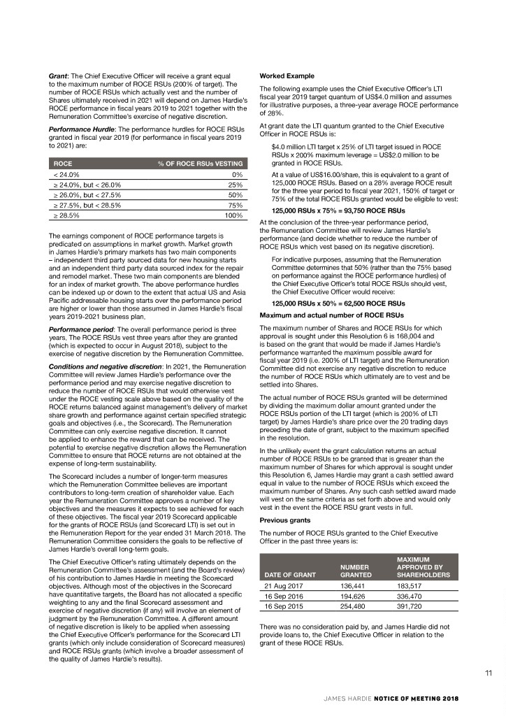 Grant: The Chief Executive Officer will receive a grant equal Worked Example to the maximum number of ROCE RSUs (200% of target). The The following example uses the Chief Executive Officer’s LTI number of ROCE RSUs which actually vest and the number of fiscal year 2019 target quantum of US$4.0 million and assumes Shares ultimately received in 2021 will depend on James Hardie’s for illustrative purposes, a three-year average ROCE performance ROCE performance in fiscal years 2019 to 2021 together with the of 28%. Remuneration Committee’s exercise of negative discretion. At grant date the LTI quantum granted to the Chief Executive Performance Hurdle: The performance hurdles for ROCE RSUs Officer in ROCE RSUs is: granted in fiscal year 2019 (for performance in fiscal years 2019 to 2021) are: $4.0 million LTI target x 25% of LTI target issued in ROCE RSUs x 200% maximum leverage = US$2.0 million to be ROCE % OF ROCE RSUs VESTING granted in ROCE RSUs. < 24.0% 0% At a value of US$16.00/share, this is equivalent to a grant of ≥ 24.0%, but < 26.0% 25% 125,000 ROCE RSUs. Based on a 28% average ROCE result for the three year period to fiscal year 2021, 150% of target or ≥ 26.0%, but < 27.5% 50% 75% of the total ROCE RSUs granted would be eligible to vest: ≥ 27.5%, but < 28.5% 75% 125,000 RSUs x 75% = 93,750 ROCE RSUs ≥ 28.5% 100% At the conclusion of the three-year performance period, the Remuneration Committee will review James Hardie’s The earnings component of ROCE performance targets is performance (and decide whether to reduce the number of predicated on assumptions in market growth. Market growth ROCE RSUs which vest based on its negative discretion). in James Hardie’s primary markets has two main components – independent third party sourced data for new housing starts For indicative purposes, assuming that the Remuneration and an independent third party data sourced index for the repair Committee determines that 50% (rather than the 75% based and remodel market. These two main components are blended on performance against the ROCE performance hurdles) of for an index of market growth. The above performance hurdles the Chief Executive Officer’s total ROCE RSUs should vest, can be indexed up or down to the extent that actual US and Asia the Chief Executive Officer would receive: Pacific addressable housing starts over the performance period 125,000 RSUs x 50% = 62,500 ROCE RSUs are higher or lower than those assumed in James Hardie’s fiscal years 2019-2021 business plan. Maximum and actual number of ROCE RSUs Performance period: The overall performance period is three The maximum number of Shares and ROCE RSUs for which years. The ROCE RSUs vest three years after they are granted approval is sought under this Resolution 6 is 168,004 and (which is expected to occur in August 2018), subject to the is based on the grant that would be made if James Hardie’s exercise of negative discretion by the Remuneration Committee. performance warranted the maximum possible award for fiscal year 2019 (i.e. 200% of LTI target) and the Remuneration Conditions and negative discretion: In 2021, the Remuneration Committee did not exercise any negative discretion to reduce Committee will review James Hardie’s performance over the the number of ROCE RSUs which ultimately are to vest and be performance period and may exercise negative discretion to settled into Shares. reduce the number of ROCE RSUs that would otherwise vest under the ROCE vesting scale above based on the quality of the The actual number of ROCE RSUs granted will be determined ROCE returns balanced against management’s delivery of market by dividing the maximum dollar amount granted under the share growth and performance against certain specified strategic ROCE RSUs portion of the LTI target (which is 200% of LTI goals and objectives (i.e., the Scorecard). The Remuneration target) by James Hardie’s share price over the 20 trading days Committee can only exercise negative discretion. It cannot preceding the date of grant, subject to the maximum specified be applied to enhance the reward that can be received. The in the resolution. potential to exercise negative discretion allows the Remuneration In the unlikely event the grant calculation returns an actual Committee to ensure that ROCE returns are not obtained at the number of ROCE RSUs to be granted that is greater than the expense of long-term sustainability. maximum number of Shares for which approval is sought under The Scorecard includes a number of longer-term measures this Resolution 6, James Hardie may grant a cash settled award which the Remuneration Committee believes are important equal in value to the number of ROCE RSUs which exceed the contributors to long-term creation of shareholder value. Each maximum number of Shares. Any such cash settled award made year the Remuneration Committee approves a number of key will vest on the same criteria as set forth above and would only objectives and the measures it expects to see achieved for each vest in the event the ROCE RSU grant vests in full. of these objectives. The fiscal year 2019 Scorecard applicable Previous grants for the grants of ROCE RSUs (and Scorecard LTI) is set out in the Remuneration Report for the year ended 31 March 2018. The The number of ROCE RSUs granted to the Chief Executive Remuneration Committee considers the goals to be reflective of Officer in the past three years is: James Hardie’s overall long-term goals. The Chief Executive Officer’s rating ultimately depends on the MAXIMUM Remuneration Committee’s assessment (and the Board’s review) NUMBER APPROVED BY of his contribution to James Hardie in meeting the Scorecard DATE OF GRANT GRANTED SHAREHOLDERS objectives. Although most of the objectives in the Scorecard 21 Aug 2017 136,441 183,517 have quantitative targets, the Board has not allocated a specific 16 Sep 2016 194,626 336,470 weighting to any and the final Scorecard assessment