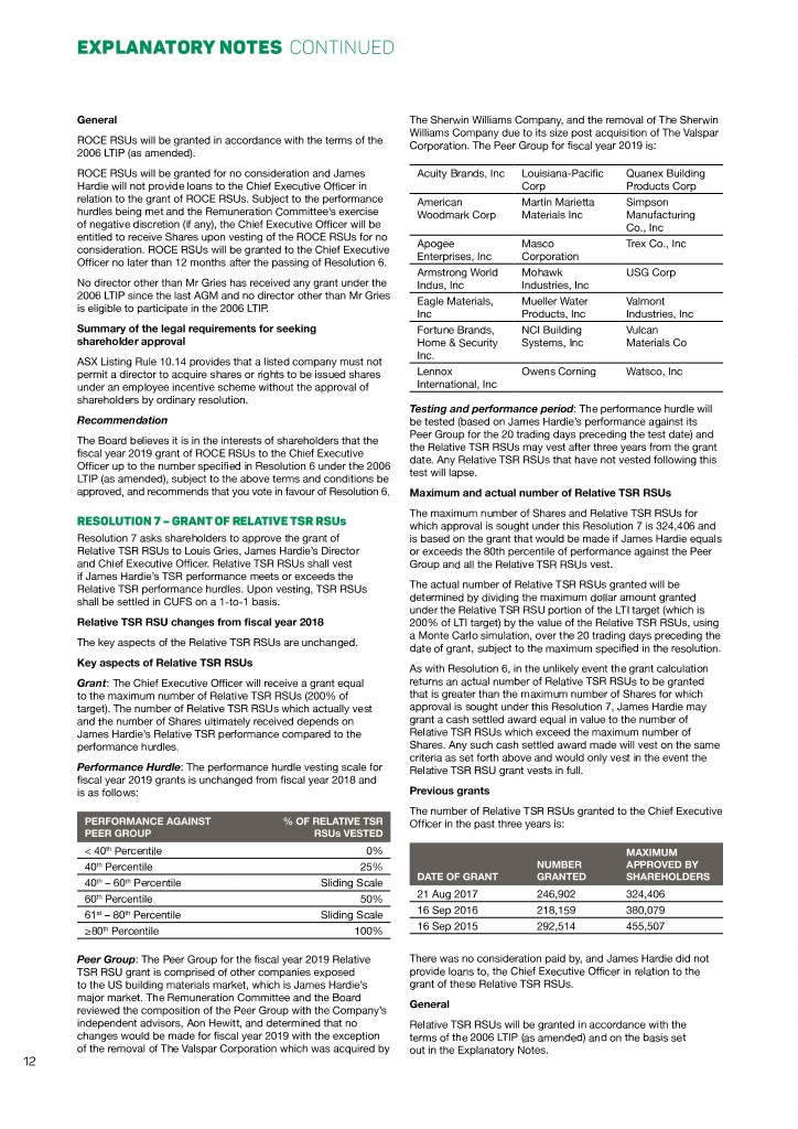 EXPLANATORY NOTES CONTINUED General The Sherwin Williams Company, and the removal of The Sherwin Williams Company due to its size post acquisition of The Valspar ROCE RSUs will be granted in accordance with the terms of the Corporation. The Peer Group for fiscal year 2019 is: 2006 LTIP (as amended). ROCE RSUs will be granted for no consideration and James Acuity Brands, Inc Louisiana-Pacific Quanex Building Hardie will not provide loans to the Chief Executive Officer in Corp Products Corp relation to the grant of ROCE RSUs. Subject to the performance American Martin Marietta Simpson hurdles being met and the Remuneration Committee’s exercise Woodmark Corp Materials Inc Manufacturing of negative discretion (if any), the Chief Executive Officer will be Co., Inc entitled to receive Shares upon vesting of the ROCE RSUs for no Apogee Masco Trex Co., Inc consideration. ROCE RSUs will be granted to the Chief Executive Enterprises, Inc Corporation Officer no later than 12 months after the passing of Resolution 6. Armstrong World Mohawk USG Corp No director other than Mr Gries has received any grant under the Indus, Inc Industries, Inc 2006 LTIP since the last AGM and no director other than Mr Gries Eagle Materials, Mueller Water Valmont is eligible to participate in the 2006 LTIP. Inc Products, Inc Industries, Inc Summary of the legal requirements for seeking Fortune Brands, NCI Building Vulcan shareholder approval Home & Security Systems, Inc Materials Co Inc. ASX Listing Rule 10.14 provides that a listed company must not permit a director to acquire shares or rights to be issued shares Lennox Owens Corning Watsco, Inc under an employee incentive scheme without the approval of International, Inc shareholders by ordinary resolution. Testing and performance period: The performance hurdle will Recommendation be tested (based on James Hardie’s performance against its Peer Group for the 20 trading days preceding the test date) and The Board believes it is in the interests of shareholders that the the Relative TSR RSUs may vest after three years from the grant fiscal year 2019 grant of ROCE RSUs to the Chief Executive date. Any Relative TSR RSUs that have not vested following this Officer up to the number specified in Resolution 6 under the 2006 test will lapse. LTIP (as amended), subject to the above terms and conditions be approved, and recommends that you vote in favour of Resolution 6. Maximum and actual number of Relative TSR RSUs The maximum number of Shares and Relative TSR RSUs for RESOLUTION 7 – GRANT OF RELATIVE TSR RSUs which approval is sought under this Resolution 7 is 324,406 and Resolution 7 asks shareholders to approve the grant of is based on the grant that would be made if James Hardie equals Relative TSR RSUs to Louis Gries, James Hardie’s Director or exceeds the 80th percentile of performance against the Peer and Chief Executive Officer. Relative TSR RSUs shall vest Group and all the Relative TSR RSUs vest. if James Hardie’s TSR performance meets or exceeds the Relative TSR performance hurdles. Upon vesting, TSR RSUs The actual number of Relative TSR RSUs granted will be shall be settled in CUFS on a 1-to-1 basis. determined by dividing the maximum dollar amount granted under the Relative TSR RSU portion of the LTI target (which is Relative TSR RSU changes from fiscal year 2018 200% of LTI target) by the value of the Relative TSR RSUs, using a Monte Carlo simulation, over the 20 trading days preceding the The key aspects of the Relative TSR RSUs are unchanged. date of grant, subject to the maximum specified in the resolution. Key aspects of Relative TSR RSUs As with Resolution 6, in the unlikely event the grant calculation Grant: The Chief Executive Officer will receive a grant equal returns an actual number of Relative TSR RSUs to be granted to the maximum number of Relative TSR RSUs (200% of that is greater than the maximum number of Shares for which target). The number of Relative TSR RSUs which actually vest approval is sought under this Resolution 7, James Hardie may and the number of Shares ultimately received depends on grant a cash settled award equal in value to the number of James Hardie’s Relative TSR performance compared to the Relative TSR RSUs which exceed the maximum number of performance hurdles. Shares. Any such cash settled award made will vest on the same criteria as set forth above and would only vest in the event the Performance Hurdle: The performance hurdle vesting scale for Relative TSR RSU grant vests in full. fiscal year 2019 grants is unchanged from fiscal year 2018 and is as follows: Previous grants The number of Relative TSR RSUs granted to the Chief Executive PERFORMANCE AGAINST % OF RELATIVE TSR Officer in the past three years is: PEER GROUP RSUs VESTED < 40th Percentile 0% MAXIMUM 40th Percentile 25% NUMBER APPROVED BY DATE OF GRANT GRANTED SHAREHOLDERS 40th – 60th Percentile Sliding Scale 60th Percentile 50% 21 Aug 2017 246,902 324,406 61st – 80th Percentile Sliding Scale 16 Sep 2016 218,159 380,079 ≥80th Percentile 100% 16 Sep 2015 292,514 455,507 Peer Group: The Peer Group for the fiscal year 2019 Relative There was no consideration paid by, and James Hardie did not TSR RSU grant is comprised of other companies exposed provide loans to, the Chief Executive Officer in relation to the to the US building materials market, which is James Hardie’s grant of these Relative TSR RSUs. major market. The Remuneration Committee and the Board General reviewed the composition of the Peer Group with the Company’s independent advisors, Aon Hewitt, and determined that no Relative TSR RSUs will be granted in accordance with the changes would be made for fiscal year 2019 with the exception terms of the 2006 LTIP (as amended) and on the basis set of the removal of The Valspar Corporation which was acquired by out in the Explanatory Notes. 12