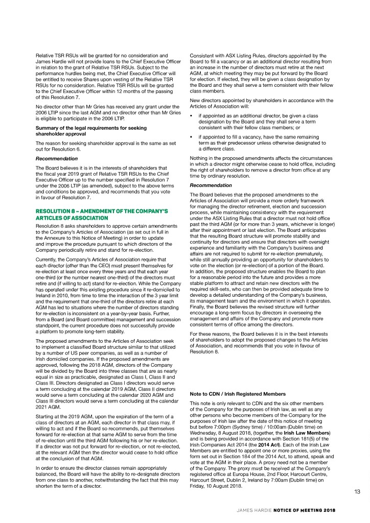 Relative TSR RSUs will be granted for no consideration and Consistent with ASX Listing Rules, directors appointed by the James Hardie will not provide loans to the Chief Executive Officer Board to fill a vacancy or as an additional director resulting from in relation to the grant of Relative TSR RSUs. Subject to the an increase in the number of directors must retire at the next performance hurdles being met, the Chief Executive Officer will AGM, at which meeting they may be put forward by the Board be entitled to receive Shares upon vesting of the Relative TSR for election. If elected, they will be given a class designation by RSUs for no consideration. Relative TSR RSUs will be granted the Board and they shall serve a term consistent with their fellow to the Chief Executive Officer within 12 months of the passing class members. of this Resolution 7. New directors appointed by shareholders in accordance with the No director other than Mr Gries has received any grant under the Articles of Association will: 2006 LTIP since the last AGM and no director other than Mr Gries §§ if appointed as an additional director, be given a class is eligible to participate in the 2006 LTIP. designation by the Board and they shall serve a term Summary of the legal requirements for seeking consistent with their fellow class members; or shareholder approval §§ if appointed to fill a vacancy, have the same remaining The reason for seeking shareholder approval is the same as set term as their predecessor unless otherwise designated to out for Resolution 6. a different class. Recommendation Nothing in the proposed amendments affects the circumstances in which a director might otherwise cease to hold office, including The Board believes it is in the interests of shareholders that the right of shareholders to remove a director from office at any the fiscal year 2019 grant of Relative TSR RSUs to the Chief time by ordinary resolution. Executive Officer up to the number specified in Resolution 7 under the 2006 LTIP (as amended), subject to the above terms Recommendation and conditions be approved, and recommends that you vote The Board believes that the proposed amendments to the in favour of Resolution 7. Articles of Association will provide a more orderly framework for managing the director retirement, election and succession RESOLUTION 8 – AMENDMENT OF THE COMPANY’S process, while maintaining consistency with the requirement ARTICLES OF ASSOCIATION under the ASX Listing Rules that a director must not hold office Resolution 8 asks shareholders to approve certain amendments past the third AGM (or for more than 3 years, whichever is longer) to the Company’s Articles of Association (as set out in full in after their appointment or last election. The Board anticipates the Annexure to this Notice of Meeting) in order to update that the resulting Board structure will promote stability and and improve the procedure pursuant to which directors of the continuity for directors and ensure that directors with oversight Company periodically retire and stand for re-election. experience and familiarity with the Company’s business and affairs are not required to submit for re-election prematurely, Currently, the Company’s Articles of Association require that while still annually providing an opportunity for shareholders to each director (other than the CEO) must present themselves for vote on the election (or re-election) of a portion of the Board. re-election at least once every three years and that each year In addition, the proposed structure enables the Board to plan one‑third (or the number nearest one-third) of the directors must for a reasonable period into the future and provides a more retire and (if willing to act) stand for re-election. While the Company stable platform to attract and retain new directors with the has operated under this existing procedure since it re-domiciled to required skill-sets, who can then be provided adequate time to Ireland in 2010, from time to time the interaction of the 3 year limit develop a detailed understanding of the Company’s business, and the requirement that one-third of the directors retire at each its management team and the environment in which it operates. AGM has led to situations where the number of directors standing Finally, the Board believes the revised structure will further for re-election is inconsistent on a year-by-year basis. Further, encourage a long-term focus by directors in overseeing the from a Board (and Board committee) management and succession management and affairs of the Company and promote more standpoint, the current procedure does not successfully provide consistent terms of office among the directors. a platform to promote long-term stability. For these reasons, the Board believes it is in the best interests The proposed amendments to the Articles of Association seek of shareholders to adopt the proposed changes to the Articles to implement a classified Board structure similar to that utilized of Association, and recommends that you vote in favour of by a number of US peer companies, as well as a number of Resolution 8. Irish domiciled companies. If the proposed amendments are approved, following the 2018 AGM, directors of the Company will be divided by the Board into three classes that are as nearly equal in size as practicable, designated as Class I, Class II and Class III. Directors designated as Class I directors would serve a term concluding at the calendar 2019 AGM, Class II directors would serve a term concluding at the calendar 2020 AGM and Note to CDN / Irish Registered Members Class III directors would serve a term concluding at the calendar This note is only relevant to CDN and the six other members 2021 AGM. of the Company for the purposes of Irish law, as well as any Starting at the 2019 AGM, upon the expiration of the term of a other persons who become members of the Company for the class of directors at an AGM, each di