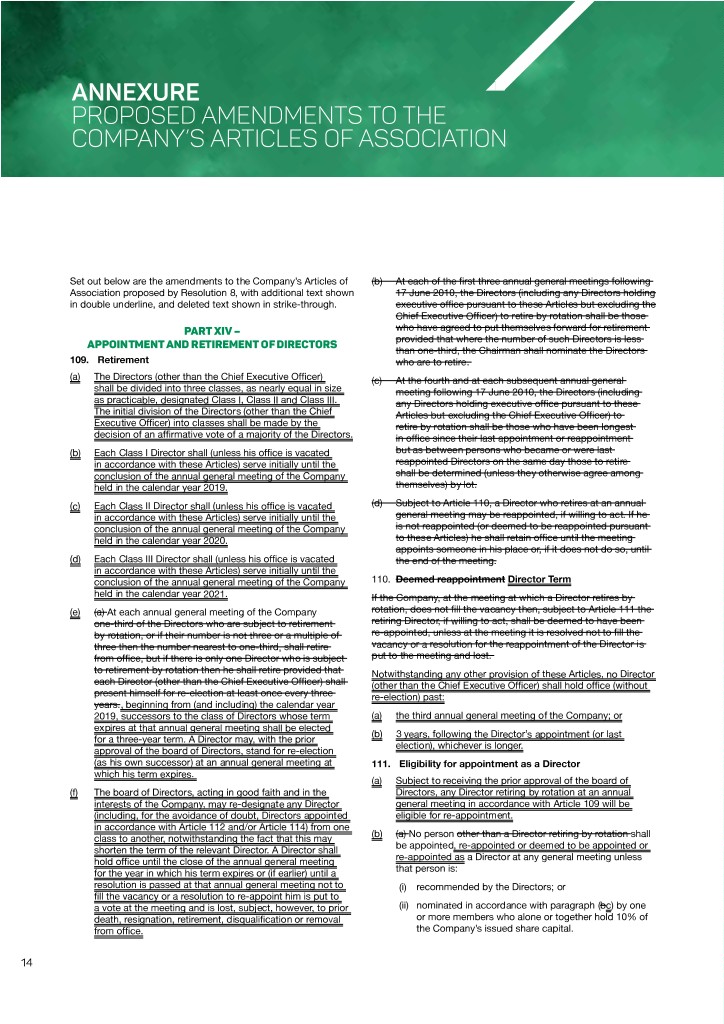 ANNEXURE PROPOSED AMENDMENTS TO THE COMPANY’S ARTICLES OF ASSOCIATION Set out below are the amendments to the Company’s Articles of (b) At each of the first three annual general meetings following Association proposed by Resolution 8, with additional text shown 17 June 2010, the Directors (including any Directors holding in double underline, and deleted text shown in strike-through. executive office pursuant to these Articles but excluding the Chief Executive Officer) to retire by rotation shall be those PART XIV – who have agreed to put themselves forward for retirement provided that where the number of such Directors is less APPOINTMENT AND RETIREMENT OF DIRECTORS than one-third, the Chairman shall nominate the Directors 109. Retirement who are to retire. (a) The Directors (other than the Chief Executive Officer) (c) At the fourth and at each subsequent annual general shall be divided into three classes, as nearly equal in size meeting following 17 June 2010, the Directors (including as practicable, designated Class I, Class II and Class III. any Directors holding executive office pursuant to these The initial division of the Directors (other than the Chief Articles but excluding the Chief Executive Officer) to Executive Officer) into classes shall be made by the retire by rotation shall be those who have been longest decision of an affirmative vote of a majority of the Directors. in office since their last appointment or reappointment (b) Each Class I Director shall (unless his office is vacated but as between persons who became or were last in accordance with these Articles) serve initially until the reappointed Directors on the same day those to retire conclusion of the annual general meeting of the Company shall be determined (unless they otherwise agree among held in the calendar year 2019. themselves) by lot. (c) Each Class II Director shall (unless his office is vacated (d) Subject to Article 110, a Director who retires at an annual in accordance with these Articles) serve initially until the general meeting may be reappointed, if willing to act. If he conclusion of the annual general meeting of the Company is not reappointed (or deemed to be reappointed pursuant held in the calendar year 2020. to these Articles) he shall retain office until the meeting appoints someone in his place or, if it does not do so, until (d) Each Class III Director shall (unless his office is vacated the end of the meeting. in accordance with these Articles) serve initially until the conclusion of the annual general meeting of the Company 110. Deemed reappointment Director Term held in the calendar year 2021. If the Company, at the meeting at which a Director retires by (e) (a) At each annual general meeting of the Company rotation, does not fill the vacancy then, subject to Article 111 the one-third of the Directors who are subject to retirement retiring Director, if willing to act, shall be deemed to have been by rotation, or if their number is not three or a multiple of re-appointed, unless at the meeting it is resolved not to fill the three then the number nearest to one-third, shall retire vacancy or a resolution for the reappointment of the Director is from office, but if there is only one Director who is subject put to the meeting and lost. to retirement by rotation then he shall retire provided that Notwithstanding any other provision of these Articles, no Director each Director (other than the Chief Executive Officer) shall (other than the Chief Executive Officer) shall hold office (without present himself for re-election at least once every three re-election) past: years., beginning from (and including) the calendar year 2019, successors to the class of Directors whose term (a) the third annual general meeting of the Company; or expires at that annual general meeting shall be elected (b) 3 years, following the Director’s appointment (or last for a three-year term. A Director may, with the prior election), whichever is longer. approval of the board of Directors, stand for re-election (as his own successor) at an annual general meeting at 111. Eligibility for appointment as a Director which his term expires. (a) Subject to receiving the prior approval of the board of (f) The board of Directors, acting in good faith and in the Directors, any Director retiring by rotation at an annual interests of the Company, may re-designate any Director general meeting in accordance with Article 109 will be (including, for the avoidance of doubt, Directors appointed eligible for re-appointment. in accordance with Article 112 and/or Article 114) from one class to another, notwithstanding the fact that this may (b) (a) No person other than a Director retiring by rotation shall shorten the term of the relevant Director. A Director shall be appointed, re-appointed or deemed to be appointed or hold office until the close of the annual general meeting re-appointed as a Director at any general meeting unless for the year in which his term expires or (if earlier) until a that person is: resolution is passed at that annual general meeting not to (i) recommended by the Directors; or fill the vacancy or a resolution to re-appoint him is put to a vote at the meeting and is lost, subject, however, to prior (ii) nominated in accordance with paragraph (bc) by one death, resignation, retirement, disqualification or removal or more members who alone or together hold 10% of from office. the Company’s issued share capital. 14