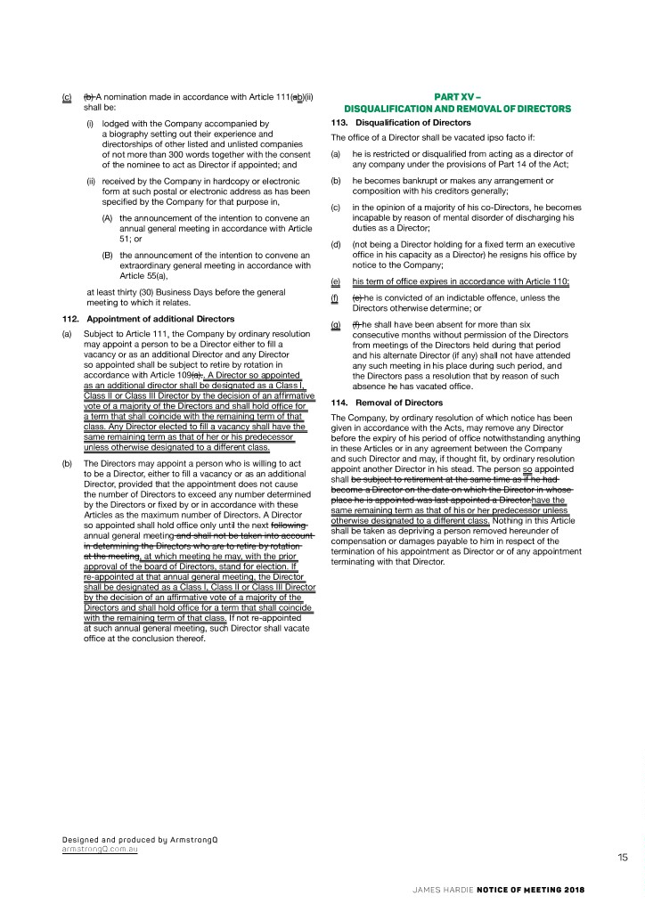 (c) (b) A nomination made in accordance with Article 111(ab)(ii) PART XV – shall be: DISQUALIFICATION AND REMOVAL OF DIRECTORS (i) lodged with the Company accompanied by 113. Disqualification of Directors a biography setting out their experience and The office of a Director shall be vacated ipso facto if: directorships of other listed and unlisted companies of not more than 300 words together with the consent (a) he is restricted or disqualified from acting as a director of of the nominee to act as Director if appointed; and any company under the provisions of Part 14 of the Act; (ii) received by the Company in hardcopy or electronic (b) he becomes bankrupt or makes any arrangement or form at such postal or electronic address as has been composition with his creditors generally; specified by the Company for that purpose in, (c) in the opinion of a majority of his co-Directors, he becomes (A) the announcement of the intention to convene an incapable by reason of mental disorder of discharging his annual general meeting in accordance with Article duties as a Director; 51; or (d) (not being a Director holding for a fixed term an executive (B) the announcement of the intention to convene an office in his capacity as a Director) he resigns his office by extraordinary general meeting in accordance with notice to the Company; Article 55(a), (e) his term of office expires in accordance with Article 110; at least thirty (30) Business Days before the general (f) (e) he is convicted of an indictable offence, unless the meeting to which it relates. Directors otherwise determine; or 112. Appointment of additional Directors (g) (f) he shall have been absent for more than six (a) Subject to Article 111, the Company by ordinary resolution consecutive months without permission of the Directors may appoint a person to be a Director either to fill a from meetings of the Directors held during that period vacancy or as an additional Director and any Director and his alternate Director (if any) shall not have attended so appointed shall be subject to retire by rotation in any such meeting in his place during such period, and accordance with Article 109(a).. A Director so appointed the Directors pass a resolution that by reason of such as an additional director shall be designated as a Class I, absence he has vacated office. Class II or Class III Director by the decision of an affirmative vote of a majority of the Directors and shall hold office for 114. Removal of Directors a term that shall coincide with the remaining term of that The Company, by ordinary resolution of which notice has been class. Any Director elected to fill a vacancy shall have the given in accordance with the Acts, may remove any Director same remaining term as that of her or his predecessor before the expiry of his period of office notwithstanding anything unless otherwise designated to a different class. in these Articles or in any agreement between the Company and such Director and may, if thought fit, by ordinary resolution (b) The Directors may appoint a person who is willing to act appoint another Director in his stead. The person so appointed to be a Director, either to fill a vacancy or as an additional shall be subject to retirement at the same time as if he had Director, provided that the appointment does not cause become a Director on the date on which the Director in whose the number of Directors to exceed any number determined place he is appointed was last appointed a Director.have the by the Directors or fixed by or in accordance with these same remaining term as that of his or her predecessor unless Articles as the maximum number of Directors. A Director otherwise designated to a different class. Nothing in this Article so appointed shall hold office only until the next following shall be taken as depriving a person removed hereunder of annual general meeting and shall not be taken into account compensation or damages payable to him in respect of the in determining the Directors who are to retire by rotation termination of his appointment as Director or of any appointment at the meeting, at which meeting he may, with the prior terminating with that Director. approval of the board of Directors, stand for election. If re-appointed at that annual general meeting, the Director shall be designated as a Class I, Class II or Class III Director by the decision of an affirmative vote of a majority of the Directors and shall hold office for a term that shall coincide with the remaining term of that class. If not re-appointed at such annual general meeting, such Director shall vacate office at the conclusion thereof. Designed and produced by ArmstrongQ armstrongQ.com.au 15 JAMES HARDIE NOTICE OF MEETING 2018