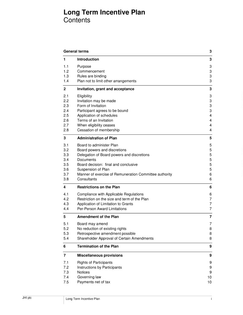 Long Term Incentive Plan Contents General terms 3 1 Introduction 3 1.1 Purpose 3 1.2 Commencement 3 1.3 Rules are binding 3 1.4 Plan not to limit other arrangements 3 2 Invitation, grant and acceptance 3 2.1 Eligibility 3 2.2 Invitation may be made 3 2.3 Form of Invitation 3 2.4 Participant agrees to be bound 3 2.5 Application of schedules 4 2.6 Terms of an Invitation 4 2.7 When eligibility ceases 4 2.8 Cessation of membership 4 3 Administration of Plan 5 3.1 Board to administer Plan 5 3.2 Board powers and discretions 5 3.3 Delegation of Board powers and discretions 5 3.4 Documents 5 3.5 Board decision: final and conclusive 5 3.6 Suspension of Plan 5 3.7 Manner of exercise of Remuneration Committee authority 6 3.8 Consultants 6 4 Restrictions on the Plan 6 4.1 Compliance with Applicable Regulations 6 4.2 Restriction on the size and term of the Plan 7 4.3 Application of Limitation to Grants 7 4.4 Per-Person Award Limitations 7 5 Amendment of the Plan 7 5.1 Board may amend 7 5.2 No reduction of existing rights 8 5.3 Retrospective amendment possible 8 5.4 Shareholder Approval of Certain Amendments 8 6 Termination of the Plan 9 7 Miscellaneous provisions 9 7.1 Rights of Participants 9 7.2 Instructions by Participants 9 7.3 Notices 9 7.4 Governing law 10 7.5 Payments net of tax 10 JHI plc Long Term Incentive Plan i