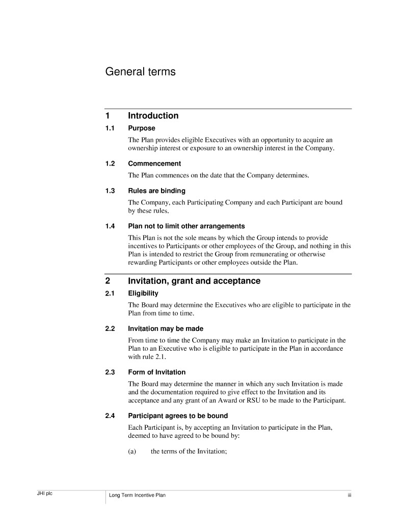 General terms 1 Introduction 1.1 Purpose The Plan provides eligible Executives with an opportunity to acquire an ownership interest or exposure to an ownership interest in the Company. 1.2 Commencement The Plan commences on the date that the Company determines. 1.3 Rules are binding The Company, each Participating Company and each Participant are bound by these rules. 1.4 Plan not to limit other arrangements This Plan is not the sole means by which the Group intends to provide incentives to Participants or other employees of the Group, and nothing in this Plan is intended to restrict the Group from remunerating or otherwise rewarding Participants or other employees outside the Plan. 2 Invitation, grant and acceptance 2.1 Eligibility The Board may determine the Executives who are eligible to participate in the Plan from time to time. 2.2 Invitation may be made From time to time the Company may make an Invitation to participate in the Plan to an Executive who is eligible to participate in the Plan in accordance with rule 2.1. 2.3 Form of Invitation The Board may determine the manner in which any such Invitation is made and the documentation required to give effect to the Invitation and its acceptance and any grant of an Award or RSU to be made to the Participant. 2.4 Participant agrees to be bound Each Participant is, by accepting an Invitation to participate in the Plan, deemed to have agreed to be bound by: (a) the terms of the Invitation; JHI plc Long Term Incentive Plan iii