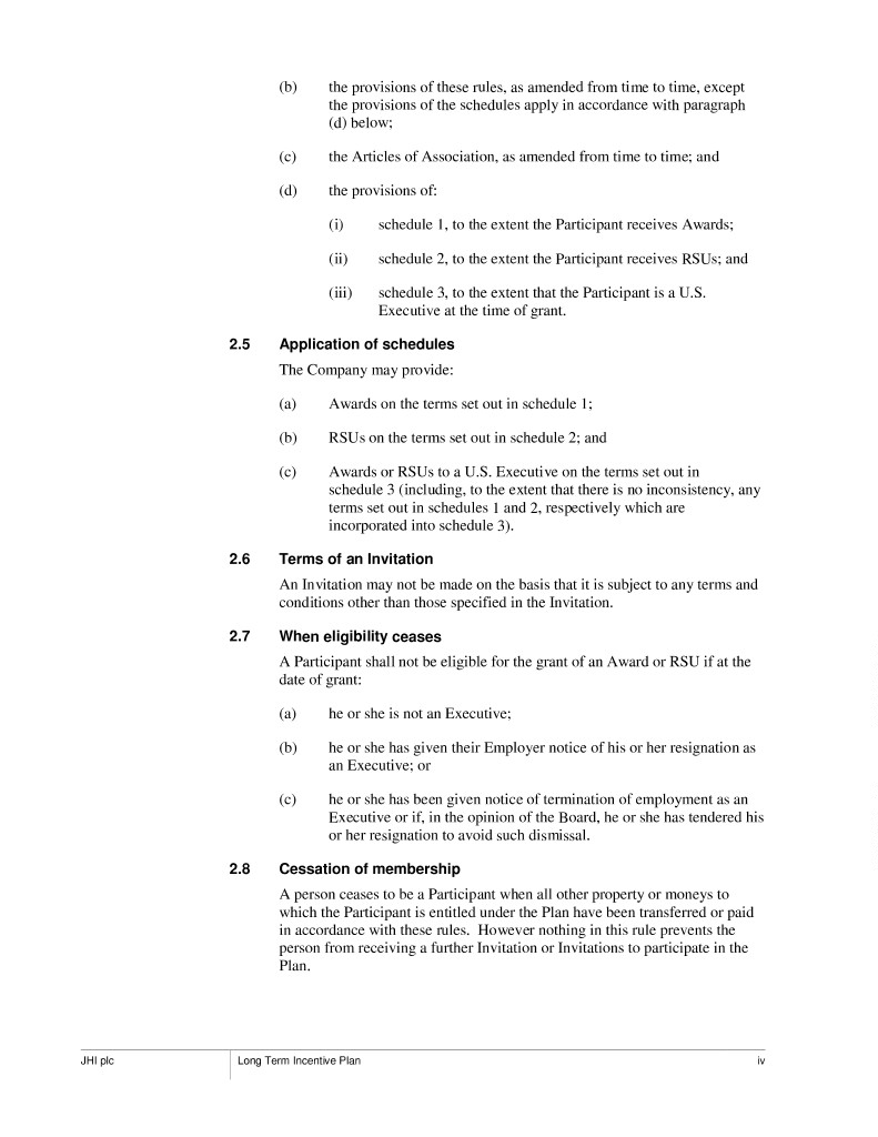 (b) the provisions of these rules, as amended from time to time, except the provisions of the schedules apply in accordance with paragraph (d) below; (c) the Articles of Association, as amended from time to time; and (d) the provisions of: (i) schedule 1, to the extent the Participant receives Awards; (ii) schedule 2, to the extent the Participant receives RSUs; and (iii) schedule 3, to the extent that the Participant is a U.S. Executive at the time of grant. 2.5 Application of schedules The Company may provide: (a) Awards on the terms set out in schedule 1; (b) RSUs on the terms set out in schedule 2; and (c) Awards or RSUs to a U.S. Executive on the terms set out in schedule 3 (including, to the extent that there is no inconsistency, any terms set out in schedules 1 and 2, respectively which are incorporated into schedule 3). 2.6 Terms of an Invitation An Invitation may not be made on the basis that it is subject to any terms and conditions other than those specified in the Invitation. 2.7 When eligibility ceases A Participant shall not be eligible for the grant of an Award or RSU if at the date of grant: (a) he or she is not an Executive; (b) he or she has given their Employer notice of his or her resignation as an Executive; or (c) he or she has been given notice of termination of employment as an Executive or if, in the opinion of the Board, he or she has tendered his or her resignation to avoid such dismissal. 2.8 Cessation of membership A person ceases to be a Participant when all other property or moneys to which the Participant is entitled under the Plan have been transferred or paid in accordance with these rules. However nothing in this rule prevents the person from receiving a further Invitation or Invitations to participate in the Plan. JHI plc Long Term Incentive Plan iv