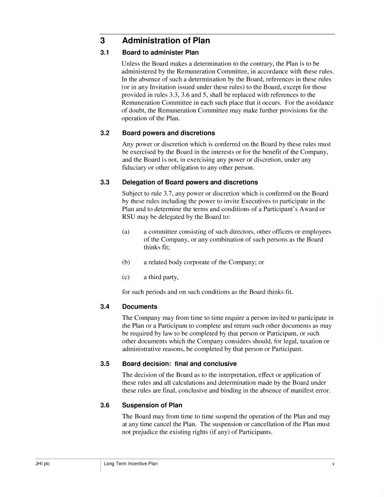 3 Administration of Plan 3.1 Board to administer Plan Unless the Board makes a determination to the contrary, the Plan is to be administered by the Remuneration Committee, in accordance with these rules. In the absence of such a determination by the Board, references in these rules (or in any Invitation issued under these rules) to the Board, except for those provided in rules 3.3, 3.6 and 5, shall be replaced with references to the Remuneration Committee in each such place that it occurs. For the avoidance of doubt, the Remuneration Committee may make further provisions for the operation of the Plan. 3.2 Board powers and discretions Any power or discretion which is conferred on the Board by these rules must be exercised by the Board in the interests or for the benefit of the Company, and the Board is not, in exercising any power or discretion, under any fiduciary or other obligation to any other person. 3.3 Delegation of Board powers and discretions Subject to rule 3.7, any power or discretion which is conferred on the Board by these rules including the power to invite Executives to participate in the Plan and to determine the terms and conditions of a Participant’s Award or RSU may be delegated by the Board to: (a) a committee consisting of such directors, other officers or employees of the Company, or any combination of such persons as the Board thinks fit; (b) a related body corporate of the Company; or (c) a third party, for such periods and on such conditions as the Board thinks fit. 3.4 Documents The Company may from time to time require a person invited to participate in the Plan or a Participant to complete and return such other documents as may be required by law to be completed by that person or Participant, or such other documents which the Company considers should, for legal, taxation or administrative reasons, be completed by that person or Participant. 3.5 Board decision: final and conclusive The decision of the Board as to the interpretation, effect or application of these rules and all calculations and determination made by the Board under these rules are final, conclusive and binding in the absence of manifest error. 3.6 Suspension of Plan The Board may from time to time suspend the operation of the Plan and may at any time cancel the Plan. The suspension or cancellation of the Plan must not prejudice the existing rights (if any) of Participants. JHI plc Long Term Incentive Plan v