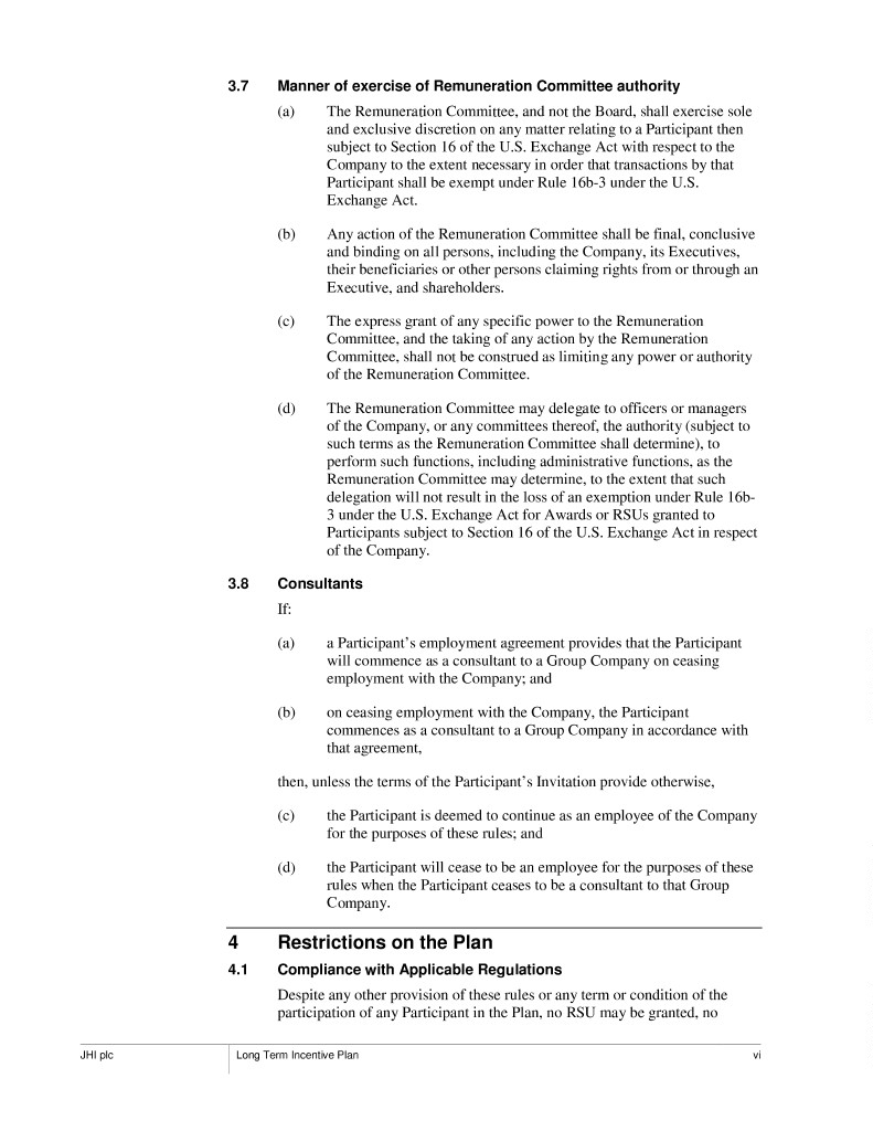 3.7 Manner of exercise of Remuneration Committee authority (a) The Remuneration Committee, and not the Board, shall exercise sole and exclusive discretion on any matter relating to a Participant then subject to Section 16 of the U.S. Exchange Act with respect to the Company to the extent necessary in order that transactions by that Participant shall be exempt under Rule 16b-3 under the U.S. Exchange Act. (b) Any action of the Remuneration Committee shall be final, conclusive and binding on all persons, including the Company, its Executives, their beneficiaries or other persons claiming rights from or through an Executive, and shareholders. (c) The express grant of any specific power to the Remuneration Committee, and the taking of any action by the Remuneration Committee, shall not be construed as limiting any power or authority of the Remuneration Committee. (d) The Remuneration Committee may delegate to officers or managers of the Company, or any committees thereof, the authority (subject to such terms as the Remuneration Committee shall determine), to perform such functions, including administrative functions, as the Remuneration Committee may determine, to the extent that such delegation will not result in the loss of an exemption under Rule 16b- 3 under the U.S. Exchange Act for Awards or RSUs granted to Participants subject to Section 16 of the U.S. Exchange Act in respect of the Company. 3.8 Consultants If: (a) a Participant’s employment agreement provides that the Participant will commence as a consultant to a Group Company on ceasing employment with the Company; and (b) on ceasing employment with the Company, the Participant commences as a consultant to a Group Company in accordance with that agreement, then, unless the terms of the Participant’s Invitation provide otherwise, (c) the Participant is deemed to continue as an employee of the Company for the purposes of these rules; and (d) the Participant will cease to be an employee for the purposes of these rules when the Participant ceases to be a consultant to that Group Company. 4 Restrictions on the Plan 4.1 Compliance with Applicable Regulations Despite any other provision of these rules or any term or condition of the participation of any Participant in the Plan, no RSU may be granted, no JHI plc Long Term Incentive Plan vi