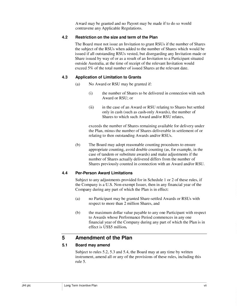 Award may be granted and no Payout may be made if to do so would contravene any Applicable Regulations. 4.2 Restriction on the size and term of the Plan The Board must not issue an Invitation to grant RSUs if the number of Shares the subject of the RSUs when added to the number of Shares which would be issued if all outstanding RSUs vested, but disregarding any Invitation made or Share issued by way of or as a result of an Invitation to a Participant situated outside Australia, at the time of receipt of the relevant Invitation would exceed 5% of the total number of issued Shares at the relevant date. 4.3 Application of Limitation to Grants (a) No Award or RSU may be granted if: (i) the number of Shares to be delivered in connection with such Award or RSU; or (ii) in the case of an Award or RSU relating to Shares but settled only in cash (such as cash-only Awards), the number of Shares to which such Award and/or RSU relates, exceeds the number of Shares remaining available for delivery under the Plan, minus the number of Shares deliverable in settlement of or relating to then outstanding Awards and/or RSUs. (b) The Board may adopt reasonable counting procedures to ensure appropriate counting, avoid double counting (as, for example, in the case of tandem or substitute awards) and make adjustments if the number of Shares actually delivered differs from the number of Shares previously counted in connection with an Award and/or RSU. 4.4 Per-Person Award Limitations Subject to any adjustments provided for in Schedule 1 or 2 of these rules, if the Company is a U.S. Non-exempt Issuer, then in any financial year of the Company during any part of which the Plan is in effect: (a) no Participant may be granted Share-settled Awards or RSUs with respect to more than 2 million Shares, and (b) the maximum dollar value payable to any one Participant with respect to Awards whose Performance Period commences in any one financial year of the Company during any part of which the Plan is in effect is US$5 million . 5 Amendment of the Plan 5.1 Board may amend Subject to rules 5.2, 5.3 and 5.4, the Board may at any time by written instrument, amend all or any of the provisions of these rules, including this rule 5. JHI plc Long Term Incentive Plan vii