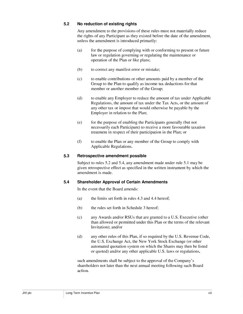 5.2 No reduction of existing rights Any amendment to the provisions of these rules must not materially reduce the rights of any Participant as they existed before the date of the amendment, unless the amendment is introduced primarily: (a) for the purpose of complying with or conforming to present or future law or regulation governing or regulating the maintenance or operation of the Plan or like plans; (b) to correct any manifest error or mistake; (c) to enable contributions or other amounts paid by a member of the Group to the Plan to qualify as income tax deductions for that member or another member of the Group; (d) to enable any Employer to reduce the amount of tax under Applicable Regulations, the amount of tax under the Tax Acts, or the amount of any other tax or impost that would otherwise be payable by the Employer in relation to the Plan; (e) for the purpose of enabling the Participants generally (but not necessarily each Participant) to receive a more favourable taxation treatment in respect of their participation in the Plan; or (f) to enable the Plan or any member of the Group to comply with Applicable Regulations. 5.3 Retrospective amendment possible Subject to rules 5.2 and 5.4, any amendment made under rule 5.1 may be given retrospective effect as specified in the written instrument by which the amendment is made. 5.4 Shareholder Approval of Certain Amendments In the event that the Board amends: (a) the limits set forth in rules 4.3 and 4.4 hereof; (b) the rules set forth in Schedule 3 hereof; (c) any Awards and/or RSUs that are granted to a U.S. Executive (other than allowed or permitted under this Plan or the terms of the relevant Invitation); and/or (d) any other rules of this Plan, if so required by the U.S. Revenue Code, the U.S. Exchange Act, the New York Stock Exchange (or other automated quotation system on which the Shares may then be listed or quoted) and/or any other applicable U.S. laws or regulations, such amendments shall be subject to the approval of the Company’s shareholders not later than the next annual meeting following such Board action. JHI plc Long Term Incentive Plan viii
