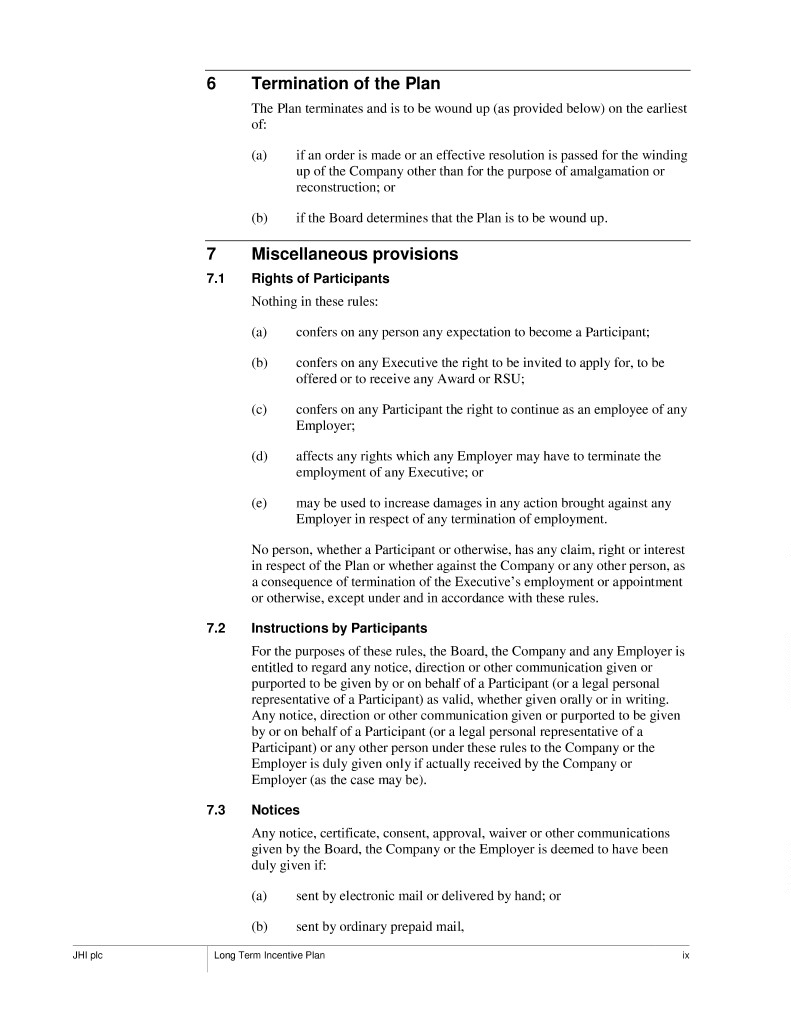 6 Termination of the Plan The Plan terminates and is to be wound up (as provided below) on the earliest of: (a) if an order is made or an effective resolution is passed for the winding up of the Company other than for the purpose of amalgamation or reconstruction; or (b) if the Board determines that the Plan is to be wound up. 7 Miscellaneous provisions 7.1 Rights of Participants Nothing in these rules: (a) confers on any person any expectation to become a Participant; (b) confers on any Executive the right to be invited to apply for, to be offered or to receive any Award or RSU; (c) confers on any Participant the right to continue as an employee of any Employer; (d) affects any rights which any Employer may have to terminate the employment of any Executive; or (e) may be used to increase damages in any action brought against any Employer in respect of any termination of employment. No person, whether a Participant or otherwise, has any claim, right or interest in respect of the Plan or whether against the Company or any other person, as a consequence of termination of the Executive’s employment or appointment or otherwise, except under and in accordance with these rules. 7.2 Instructions by Participants For the purposes of these rules, the Board, the Company and any Employer is entitled to regard any notice, direction or other communication given or purported to be given by or on behalf of a Participant (or a legal personal representative of a Participant) as valid, whether given orally or in writing. Any notice, direction or other communication given or purported to be given by or on behalf of a Participant (or a legal personal representative of a Participant) or any other person under these rules to the Company or the Employer is duly given only if actually received by the Company or Employer (as the case may be). 7.3 Notices Any notice, certificate, consent, approval, waiver or other communications given by the Board, the Company or the Employer is deemed to have been duly given if: (a) sent by electronic mail or delivered by hand; or (b) sent by ordinary prepaid mail, JHI plc Long Term Incentive Plan ix