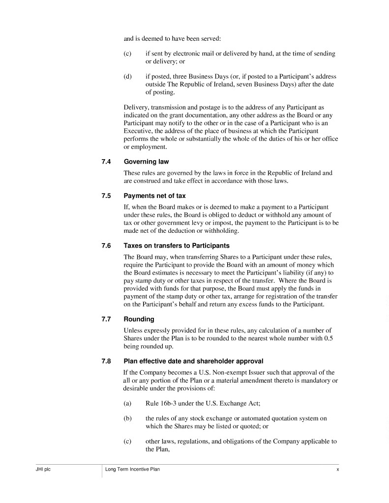 and is deemed to have been served: (c) if sent by electronic mail or delivered by hand, at the time of sending or delivery; or (d) if posted, three Business Days (or, if posted to a Participant’s address outside The Republic of Ireland, seven Business Days) after the date of posting. Delivery, transmission and postage is to the address of any Participant as indicated on the grant documentation, any other address as the Board or any Participant may notify to the other or in the case of a Participant who is an Executive, the address of the place of business at which the Participant performs the whole or substantially the whole of the duties of his or her office or employment. 7.4 Governing law These rules are governed by the laws in force in the Republic of Ireland and are construed and take effect in accordance with those laws. 7.5 Payments net of tax If, when the Board makes or is deemed to make a payment to a Participant under these rules, the Board is obliged to deduct or withhold any amount of tax or other government levy or impost, the payment to the Participant is to be made net of the deduction or withholding. 7.6 Taxes on transfers to Participants The Board may, when transferring Shares to a Participant under these rules, require the Participant to provide the Board with an amount of money which the Board estimates is necessary to meet the Participant’s liability (if any) to pay stamp duty or other taxes in respect of the transfer. Where the Board is provided with funds for that purpose, the Board must apply the funds in payment of the stamp duty or other tax, arrange for registration of the transfer on the Participant’s behalf and return any excess funds to the Participant. 7.7 Rounding Unless expressly provided for in these rules, any calculation of a number of Shares under the Plan is to be rounded to the nearest whole number with 0.5 being rounded up. 7.8 Plan effective date and shareholder approval If the Company becomes a U.S. Non-exempt Issuer such that approval of the all or any portion of the Plan or a material amendment thereto is mandatory or desirable under the provisions of: (a) Rule 16b-3 under the U.S. Exchange Act; (b) the rules of any stock exchange or automated quotation system on which the Shares may be listed or quoted; or (c) other laws, regulations, and obligations of the Company applicable to the Plan, JHI plc Long Term Incentive Plan x