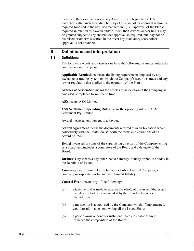 then (i) to the extent necessary, any Awards or RSUs granted to U.S. Executives after such time shall be subject to shareholder approval within the required time and in the required manner; and (ii) if approval of the Plan is required in relation to Awards and/or RSUs, then Awards and/or RSUs may be granted subject to any shareholder approval so required, but may not be exercised or otherwise settled in the event any mandatory shareholder approval is not obtained. 8 Definitions and interpretation 8.1 Definitions The following words and expressions have the following meanings unless the contrary intention appears: Applicable Regulations means the listing requirements imposed by any exchange or trading system on which the Company’s securities trade and any law or regulation that applies to the operation of the Plan. Articles of Association means the articles of association of the Company as amended or replaced from time to time. ASX means ASX Limited. ASX Settlement Operating Rules means the operating rules of ASX Settlement Pty Limited. Award means an entitlement to a Payout. Award Agreement means the documents referred to in an Invitation which, collectively with the Invitation, set forth the terms and conditions of an Award or RSU. Board means all or some of the supervising directors of the Company acting as a board, and includes a committee of the Board and a delegate of the Board. Business Day means a day other than a Saturday, Sunday or public holiday in the Republic of Ireland. Company means James Hardie Industries Public Limited Company, a company incorporated in Ireland with limited liability. Control Event means any of the following: (a) a takeover bid is made to acquire the whole of the issued Shares and the takeover bid is recommended by the Board or becomes unconditional; (b) a transaction is announced by the Company which, if implemented, would result in a person owning all the issued Shares; (b) a person owns or controls sufficient Shares to enable them to influence the composition of the Board; JHI plc Long Term Incentive Plan xi
