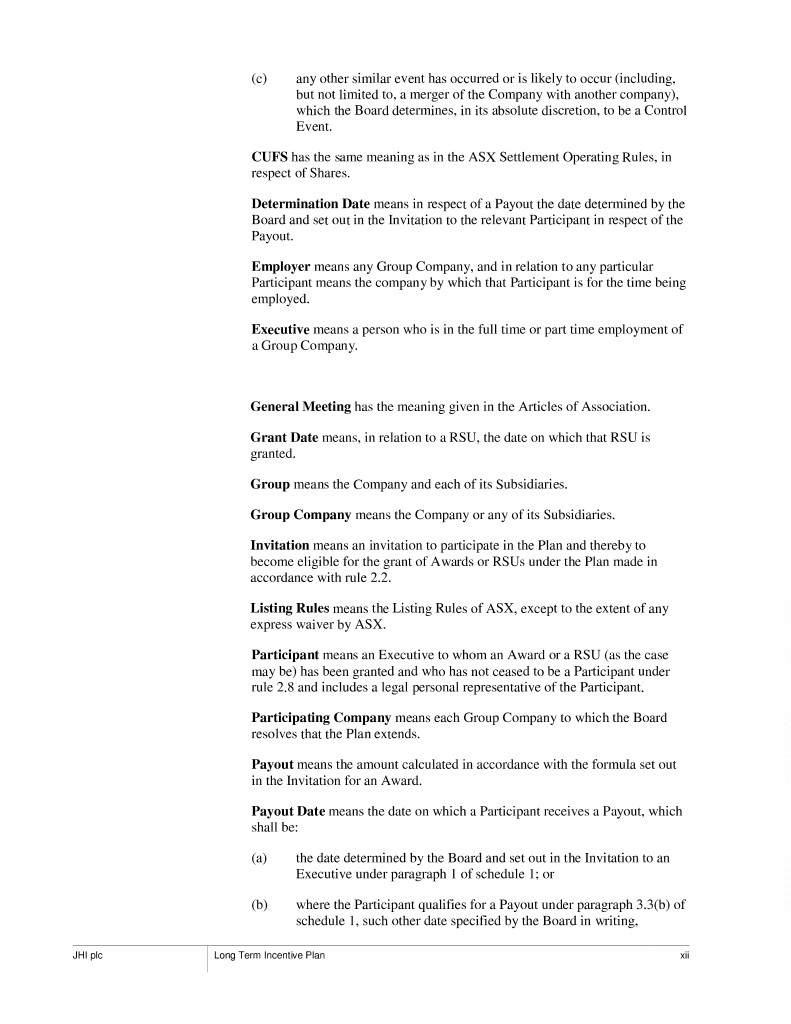 (c) any other similar event has occurred or is likely to occur (including, but not limited to, a merger of the Company with another company), which the Board determines, in its absolute discretion, to be a Control Event. CUFS has the same meaning as in the ASX Settlement Operating Rules, in respect of Shares. Determination Date means in respect of a Payout the date determined by the Board and set out in the Invitation to the relevant Participant in respect of the Payout. Employer means any Group Company, and in relation to any particular Participant means the company by which that Participant is for the time being employed. Executive means a person who is in the full time or part time employment of a Group Company. General Meeting has the meaning given in the Articles of Association. Grant Date means, in relation to a RSU, the date on which that RSU is granted. Group means the Company and each of its Subsidiaries. Group Company means the Company or any of its Subsidiaries. Invitation means an invitation to participate in the Plan and thereby to become eligible for the grant of Awards or RSUs under the Plan made in accordance with rule 2.2. Listing Rules means the Listing Rules of ASX, except to the extent of any express waiver by ASX. Participant means an Executive to whom an Award or a RSU (as the case may be) has been granted and who has not ceased to be a Participant under rule 2.8 and includes a legal personal representative of the Participant. Participating Company means each Group Company to which the Board resolves that the Plan extends. Payout means the amount calculated in accordance with the formula set out in the Invitation for an Award. Payout Date means the date on which a Participant receives a Payout, which shall be: (a) the date determined by the Board and set out in the Invitation to an Executive under paragraph 1 of schedule 1; or (b) where the Participant qualifies for a Payout under paragraph 3.3(b) of schedule 1, such other date specified by the Board in writing, JHI plc Long Term Incentive Plan xii