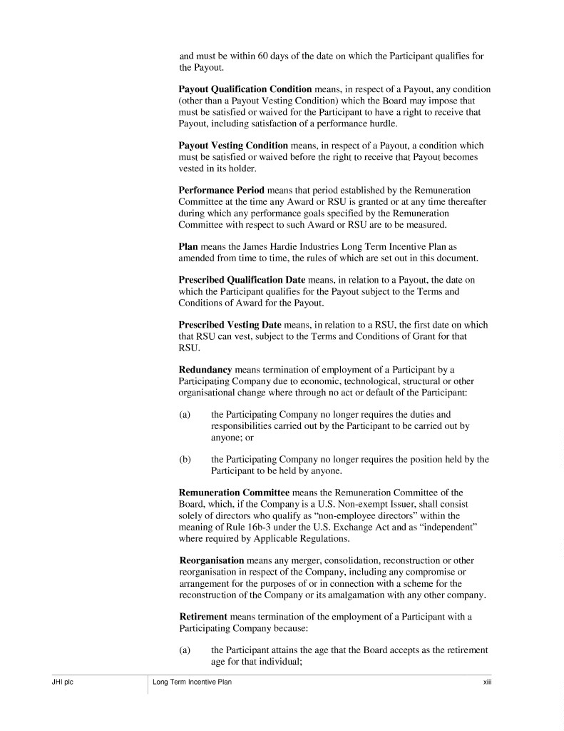 and must be within 60 days of the date on which the Participant qualifies for the Payout. Payout Qualification Condition means, in respect of a Payout, any condition (other than a Payout Vesting Condition) which the Board may impose that must be satisfied or waived for the Participant to have a right to receive that Payout, including satisfaction of a performance hurdle. Payout Vesting Condition means, in respect of a Payout, a condition which must be satisfied or waived before the right to receive that Payout becomes vested in its holder. Performance Period means that period established by the Remuneration Committee at the time any Award or RSU is granted or at any time thereafter during which any performance goals specified by the Remuneration Committee with respect to such Award or RSU are to be measured. Plan means the James Hardie Industries Long Term Incentive Plan as amended from time to time, the rules of which are set out in this document. Prescribed Qualification Date means, in relation to a Payout, the date on which the Participant qualifies for the Payout subject to the Terms and Conditions of Award for the Payout. Prescribed Vesting Date means, in relation to a RSU, the first date on which that RSU can vest, subject to the Terms and Conditions of Grant for that RSU. Redundancy means termination of employment of a Participant by a Participating Company due to economic, technological, structural or other organisational change where through no act or default of the Participant: (a) the Participating Company no longer requires the duties and responsibilities carried out by the Participant to be carried out by anyone; or (b) the Participating Company no longer requires the position held by the Participant to be held by anyone. Remuneration Committee means the Remuneration Committee of the Board, which, if the Company is a U.S. Non-exempt Issuer, shall consist solely of directors who qualify as “non-employee directors” within the meaning of Rule 16b-3 under the U.S. Exchange Act and as “independent” where required by Applicable Regulations. Reorganisation means any merger, consolidation, reconstruction or other reorganisation in respect of the Company, including any compromise or arrangement for the purposes of or in connection with a scheme for the reconstruction of the Company or its amalgamation with any other company. Retirement means termination of the employment of a Participant with a Participating Company because: (a) the Participant attains the age that the Board accepts as the retirement age for that individual; JHI plc Long Term Incentive Plan xiii