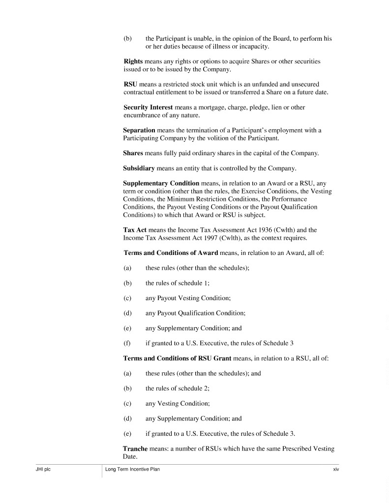 (b) the Participant is unable, in the opinion of the Board, to perform his or her duties because of illness or incapacity. Rights means any rights or options to acquire Shares or other securities issued or to be issued by the Company. RSU means a restricted stock unit which is an unfunded and unsecured contractual entitlement to be issued or transferred a Share on a future date. Security Interest means a mortgage, charge, pledge, lien or other encumbrance of any nature. Separation means the termination of a Participant’s employment with a Participating Company by the volition of the Participant. Shares means fully paid ordinary shares in the capital of the Company . Subsidiary means an entity that is controlled by the Company. Supplementary Condition means, in relation to an Award or a RSU, any term or condition (other than the rules, the Exercise Conditions, the Vesting Conditions, the Minimum Restriction Conditions, the Performance Conditions, the Payout Vesting Conditions or the Payout Qualification Conditions) to which that Award or RSU is subject. Tax Act means the Income Tax Assessment Act 1936 (Cwlth) and the Income Tax Assessment Act 1997 (Cwlth), as the context requires. Te rms and Conditions of Award means, in relation to an Award, all of: (a) these rules (other than the schedules); (b) the rules of schedule 1; (c) any Payout Vesting Condition; (d) any Payout Qualification Condition; (e) any Supplementary Condition; and (f) if granted to a U.S. Executive, the rules of Schedule 3 Terms and Conditions of RSU Grant means, in relation to a RSU, all of: (a) these rules (other than the schedules); and (b) the rules of schedule 2; (c) any Vesting Condition; (d) any Supplementary Condition; and (e) if granted to a U.S. Executive, the rules of Schedule 3. Tranche means: a number of RSUs which have the same Prescribed Vesting Date. JHI plc Long Term Incentive Plan xiv