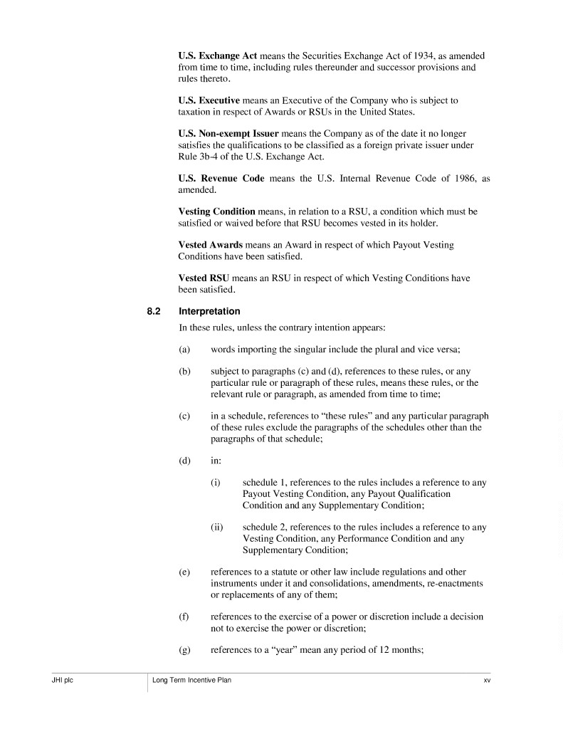 U.S. Exchange Act means the Securities Exchange Act of 1934, as amended from time to time, including rules thereunder and successor provisions and rules thereto. U.S. Executive means an Executive of the Company who is subject to taxation in respect of Awards or RSUs in the United States. U.S. Non-exempt Issuer means the Company as of the date it no longer satisfies the qualifications to be classified as a foreign private issuer under Rule 3b-4 of the U.S. Exchange Act. U.S. Revenue Code means the U.S. Internal Revenue Code of 1986, as amended. Vesting Condition means, in relation to a RSU, a condition which must be satisfied or waived before that RSU becomes vested in its holder. Vested Awards means an Award in respect of which Payout Vesting Conditions have been satisfied. Vested RSU means an RSU in respect of which Vesting Conditions have been satisfied. 8.2 Interpretation In these rules, unless the contrary intention appears: (a) words importing the singular include the plural and vice versa; (b) subject to paragraphs (c) and (d), references to these rules, or any particular rule or paragraph of these rules, means these rules, or the relevant rule or paragraph, as amended from time to time; (c) in a schedule, references to “these rules” and any particular paragraph of these rules exclude the paragraphs of the schedules other than the paragraphs of that schedule; (d) in: (i) schedule 1, references to the rules includes a reference to any Payout Vesting Condition, any Payout Qualification Condition and any Supplementary Condition; (ii) schedule 2, references to the rules includes a reference to any Vesting Condition, any Performance Condition and any Supplementary Condition; (e) references to a statute or other law include regulations and other instruments under it and consolidations, amendments, re-enactments or replacements of any of them; (f) references to the exercise of a power or discretion include a decision not to exercise the power or discretion; (g) references to a “year” mean any period of 12 months; JHI plc Long Term Incentive Plan xv