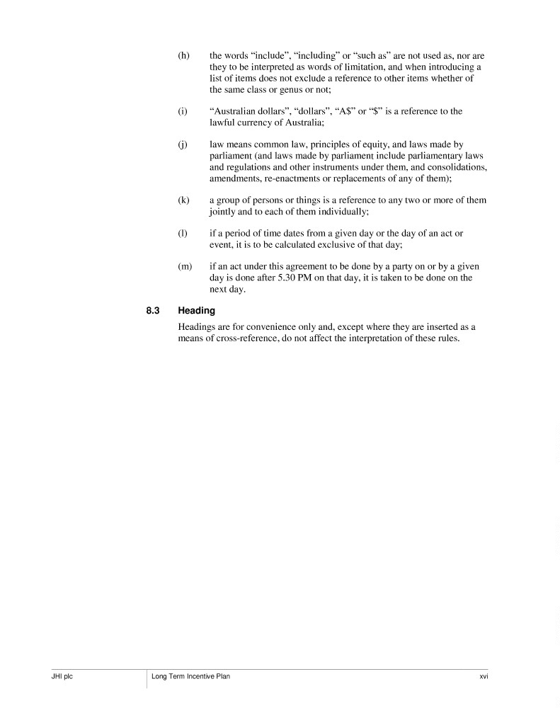 (h) the words “include”, “including” or “such as” are not used as, nor are they to be interpreted as words of limitation, and when introducing a list of items does not exclude a reference to other items whether of the same class or genus or not; (i) “Australian dollars”, “dollars”, “A$” or “$” is a reference to the lawful currency of Australia; (j) law means common law, principles of equity, and laws made by parliament (and laws made by parliament include parliamentary laws and regulations and other instruments under them, and consolidations, amendments, re-enactments or replacements of any of them); (k) a group of persons or things is a reference to any two or more of them jointly and to each of them individually; (l) if a period of time dates from a given day or the day of an act or event, it is to be calculated exclusive of that day; (m) if an act under this agreement to be done by a party on or by a given day is done after 5.30 PM on that day, it is taken to be done on the next day. 8.3 Heading Headings are for convenience only and, except where they are inserted as a means of cross-reference, do not affect the interpretation of these rules. JHI plc Long Term Incentive Plan xvi