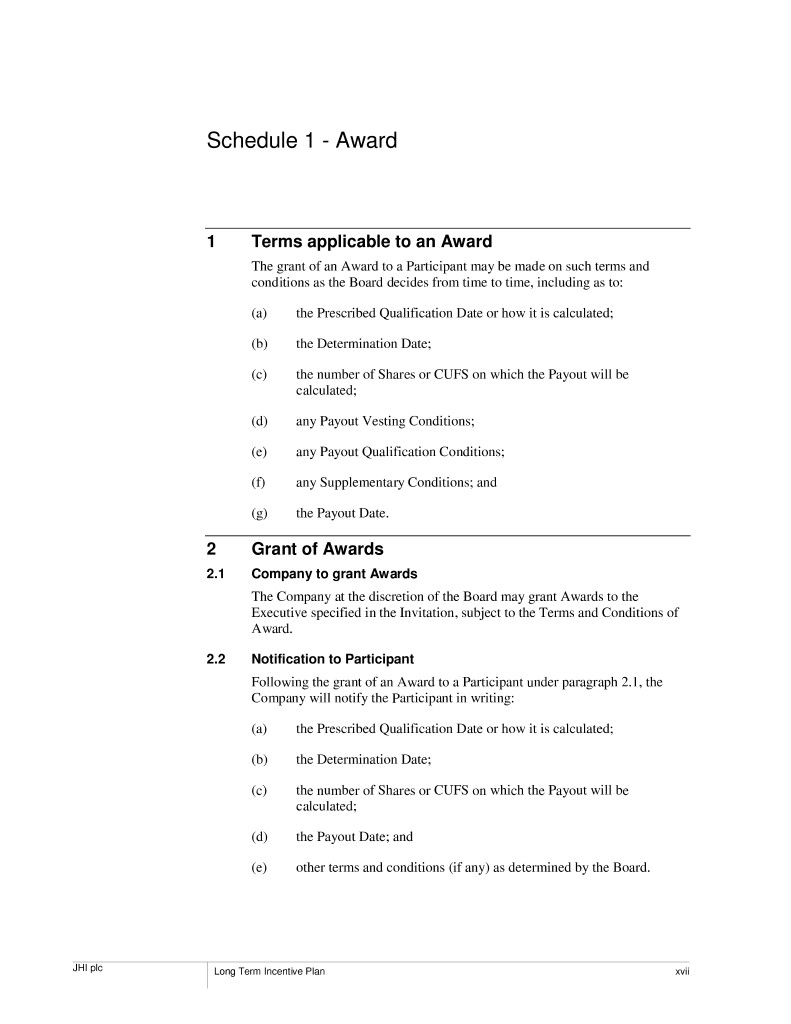 Schedule 1 - Award 1 Terms applicable to an Award The grant of an Award to a Participant may be made on such terms and conditions as the Board decides from time to time, including as to: (a) the Prescribed Qualification Date or how it is calculated; (b) the Determination Date; (c) the number of Shares or CUFS on which the Payout will be calculated; (d) any Payout Vesting Conditions; (e) any Payout Qualification Conditions; (f) any Supplementary Conditions; and (g) the Payout Date. 2 Grant of Awards 2.1 Company to grant Awards The Company at the discretion of the Board may grant Awards to the Executive specified in the Invitation, subject to the Terms and Conditions of Award. 2.2 Notification to Participant Following the grant of an Award to a Participant under paragraph 2.1, the Company will notify the Participant in writing: (a) the Prescribed Qualification Date or how it is calculated; (b) the Determination Date; (c) the number of Shares or CUFS on which the Payout will be calculated; (d) the Payout Date; and (e) other terms and conditions (if any) as determined by the Board. JHI plc Long Term Incentive Plan xvii