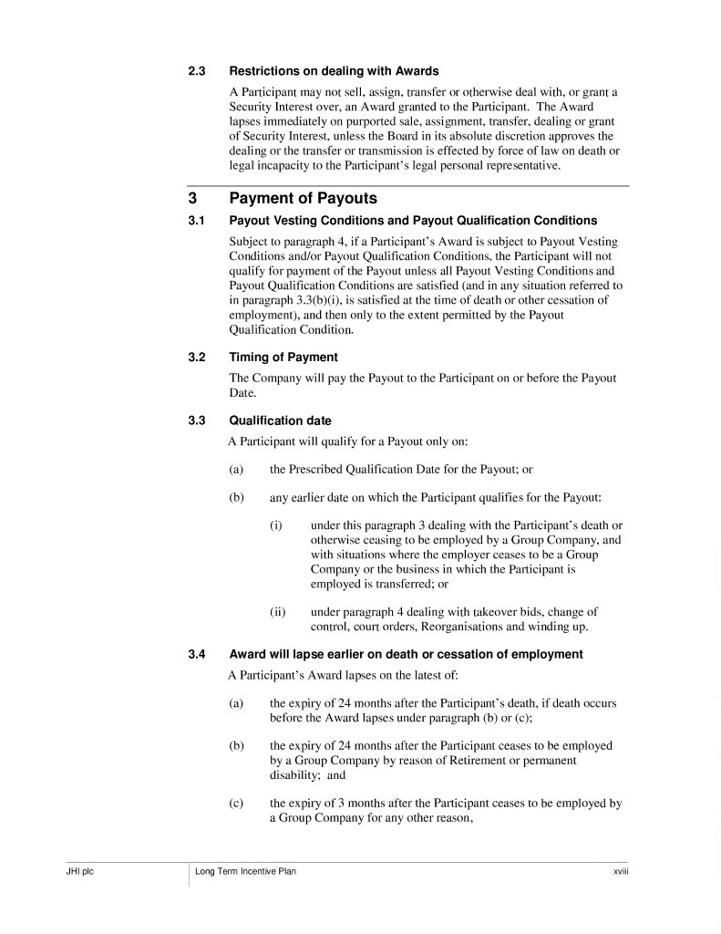 2.3 Restrictions on dealing with Awards A Participant may not sell, assign, transfer or otherwise deal with, or grant a Security Interest over, an Award granted to the Participant. The Award lapses immediately on purported sale, assignment, transfer, dealing or grant of Security Interest, unless the Board in its absolute discretion approves the dealing or the transfer or transmission is effected by force of law on death or legal incapacity to the Participant’s legal personal representative. 3 Payment of Payouts 3.1 Payout Vesting Conditions and Payout Qualification Conditions Subject to paragraph 4, if a Participant’s Award is subject to Payout Vesting Conditions and/or Payout Qualification Conditions, the Participant will not qualify for payment of the Payout unless all Payout Vesting Conditions and Payout Qualification Conditions are satisfied (and in any situation referred to in paragraph 3.3(b)(i), is satisfied at the time of death or other cessation of employment), and then only to the extent permitted by the Payout Qualification Condition. 3.2 Timing of Payment The Company will pay the Payout to the Participant on or before the Payout Date. 3.3 Qualification date A Participant will qualify for a Payout only on: (a) the Prescribed Qualification Date for the Payout; or (b) any earlier date on which the Participant qualifies for the Payout: (i) under this paragraph 3 dealing with the Participant’s death or otherwise ceasing to be employed by a Group Company, and with situations where the employer ceases to be a Group Company or the business in which the Participant is employed is transferred; or (ii) under paragraph 4 dealing with takeover bids, change of control, court orders, Reorganisations and winding up. 3.4 Award will lapse earlier on death or cessation of employment A Participant’s Award lapses on the latest of: (a) the expiry of 24 months after the Participant’s death, if death occurs before the Award lapses under paragraph (b) or (c); (b) the expiry of 24 months after the Participant ceases to be employed by a Group Company by reason of Retirement or permanent disability; and (c) the expiry of 3 months after the Participant ceases to be employed by a Group Company for any other reason, JHI plc Long Term Incentive Plan xviii