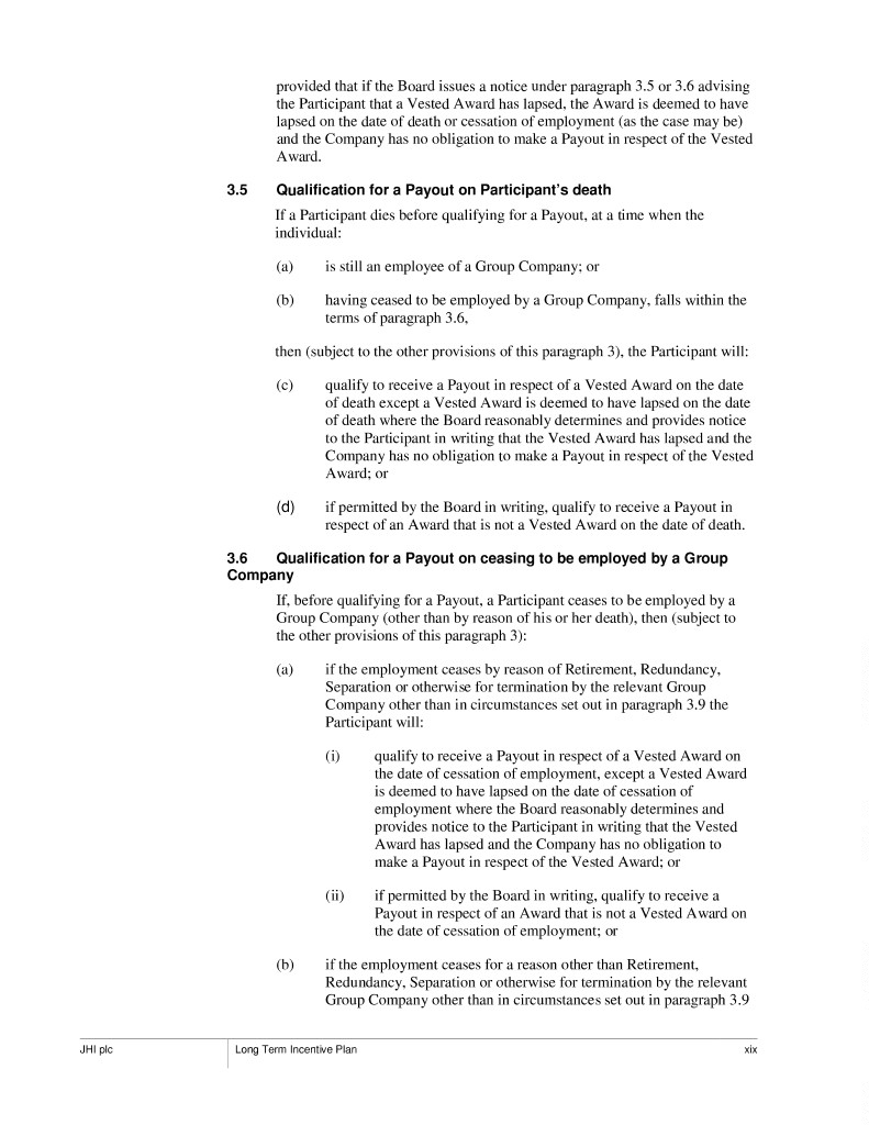 provided that if the Board issues a notice under paragraph 3.5 or 3.6 advising the Participant that a Vested Award has lapsed, the Award is deemed to have lapsed on the date of death or cessation of employment (as the case may be) and the Company has no obligation to make a Payout in respect of the Vested Award. 3.5 Qualification for a Payout on Participant’s death If a Participant dies before qualifying for a Payout, at a time when the individual: (a) is still an employee of a Group Company; or (b) having ceased to be employed by a Group Company, falls within the terms of paragraph 3.6, then (subject to the other provisions of this paragraph 3), the Participant will: (c) qualify to receive a Payout in respect of a Vested Award on the date of death except a Vested Award is deemed to have lapsed on the date of death where the Board reasonably determines and provides notice to the Participant in writing that the Vested Award has lapsed and the Company has no obligation to make a Payout in respect of the Vested Award; or (d) if permitted by the Board in writing, qualify to receive a Payout in respect of an Award that is not a Vested Award on the date of death. 3.6 Qualification for a Payout on ceasing to be employed by a Group Company If, before qualifying for a Payout, a Participant ceases to be employed by a Group Company (other than by reason of his or her death), then (subject to the other provisions of this paragraph 3): (a) if the employment ceases by reason of Retirement, Redundancy, Separation or otherwise for termination by the relevant Group Company other than in circumstances set out in paragraph 3.9 the Participant will: (i) qualify to receive a Payout in respect of a Vested Award on the date of cessation of employment, except a Vested Award is deemed to have lapsed on the date of cessation of employment where the Board reasonably determines and provides notice to the Participant in writing that the Vested Award has lapsed and the Company has no obligation to make a Payout in respect of the Vested Award; or (ii) if permitted by the Board in writing, qualify to receive a Payout in respect of an Award that is not a Vested Award on the date of cessation of employment; or (b) if the employment ceases for a reason other than Retirement, Redundancy, Separation or otherwise for termination by the relevant Group Company other than in circumstances set out in paragraph 3.9 JHI plc Long Term Incentive Plan xix