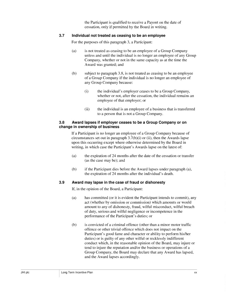 the Participant is qualified to receive a Payout on the date of cessation, only if permitted by the Board in writing. 3.7 Individual not treated as ceasing to be an employee For the purposes of this paragraph 3, a Participant: (a) is not treated as ceasing to be an employee of a Group Company unless and until the individual is no longer an employee of any Group Company, whether or not in the same capacity as at the time the Award was granted; and (b) subject to paragraph 3.8, is not treated as ceasing to be an employee of a Group Company if the individual is no longer an employee of any Group Company because: (i) the individual’s employer ceases to be a Group Company, whether or not, after the cessation, the individual remains an employee of that employer; or (ii) the individual is an employee of a business that is transferred to a person that is not a Group Company. 3.8 Award lapses if employer ceases to be a Group Company or on change in ownership of business If a Participant is no longer an employee of a Group Company because of circumstances set out in paragraph 3.7(b)(i) or (ii), then the Awards lapse upon this occurring except where otherwise determined by the Board in writing, in which case the Participant’s Awards lapse on the latest of: (a) the expiration of 24 months after the date of the cessation or transfer (as the case may be); and (b) if the Participant dies before the Award lapses under paragraph (a), the expiration of 24 months after the individual’s death. 3.9 Award may lapse in the case of fraud or dishonesty If, in the opinion of the Board, a Participant: (a) has committed (or it is evident the Participant intends to commit), any act (whether by omission or commission) which amounts or would amount to any of dishonesty, fraud, wilful misconduct, wilful breach of duty, serious and wilful negligence or incompetence in the performance of the Participant’s duties; or (b) is convicted of a criminal offence (other than a minor motor traffic offence or other trivial offence which does not impact on the Participant’s good fame and character or ability to perform his/her duties) or is guilty of any other wilful or recklessly indifferent conduct which, in the reasonable opinion of the Board, may injure or tend to injure the reputation and/or the business or operations of a Group Company, the Board may declare that any Award has lapsed, and the Award lapses accordingly. JHI plc Long Term Incentive Plan xx