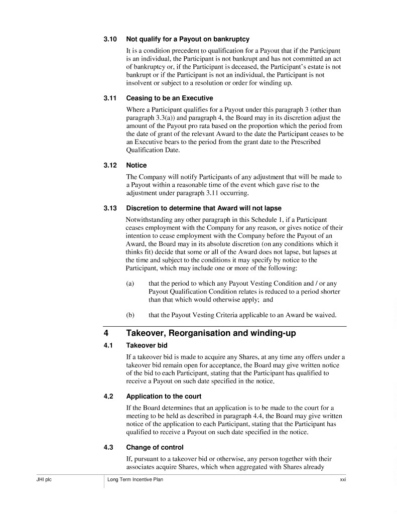 3.10 Not qualify for a Payout on bankruptcy It is a condition precedent to qualification for a Payout that if the Participant is an individual, the Participant is not bankrupt and has not committed an act of bankruptcy or, if the Participant is deceased, the Participant’s estate is not bankrupt or if the Participant is not an individual, the Participant is not insolvent or subject to a resolution or order for winding up. 3.11 Ceasing to be an Executive Where a Participant qualifies for a Payout under this paragraph 3 (other than paragraph 3.3(a)) and paragraph 4, the Board may in its discretion adjust the amount of the Payout pro rata based on the proportion which the period from the date of grant of the relevant Award to the date the Participant ceases to be an Executive bears to the period from the grant date to the Prescribed Qualification Date. 3.12 Notice The Company will notify Participants of any adjustment that will be made to a Payout within a reasonable time of the event which gave rise to the adjustment under paragraph 3.11 occurring. 3.13 Discretion to determine that Award will not lapse Notwithstanding any other paragraph in this Schedule 1, if a Participant ceases employment with the Company for any reason, or gives notice of their intention to cease employment with the Company before the Payout of an Award, the Board may in its absolute discretion (on any conditions which it thinks fit) decide that some or all of the Award does not lapse, but lapses at the time and subject to the conditions it may specify by notice to the Participant, which may include one or more of the following: (a) that the period to which any Payout Vesting Condition and / or any Payout Qualification Condition relates is reduced to a period shorter than that which would otherwise apply; and (b) that the Payout Vesting Criteria applicable to an Award be waived. 4 Takeover, Reorganisation and winding-up 4.1 Takeover bid If a takeover bid is made to acquire any Shares, at any time any offers under a takeover bid remain open for acceptance, the Board may give written notice of the bid to each Participant, stating that the Participant has qualified to receive a Payout on such date specified in the notice. 4.2 Application to the court If the Board determines that an application is to be made to the court for a meeting to be held as described in paragraph 4.4, the Board may give written notice of the application to each Participant, stating that the Participant has qualified to receive a Payout on such date specified in the notice. 4.3 Change of control If, pursuant to a takeover bid or otherwise, any person together with their associates acquire Shares, which when aggregated with Shares already JHI plc Long Term Incentive Plan xxi