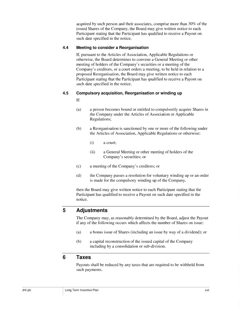 acquired by such person and their associates, comprise more than 30% of the issued Shares of the Company, the Board may give written notice to each Participant stating that the Participant has qualified to receive a Payout on such date specified in the notice. 4.4 Meeting to consider a Reorganisation If, pursuant to the Articles of Association, Applicable Regulations or otherwise, the Board determines to convene a General Meeting or other meeting of holders of the Company’s securities or a meeting of the Company’s creditors, or a court orders a meeting, to be held in relation to a proposed Reorganisation, the Board may give written notice to each Participant stating that the Participant has qualified to receive a Payout on such date specified in the notice. 4.5 Compulsory acquisition, Reorganisation or winding up If: (a) a person becomes bound or entitled to compulsorily acquire Shares in the Company under the Articles of Association or Applicable Regulations; (b) a Reorganisation is sanctioned by one or more of the following under the Articles of Association, Applicable Regulations or otherwise: (i) a court; (ii) a General Meeting or other meeting of holders of the Company’s securities; or (c) a meeting of the Company’s creditors; or (d) the Company passes a resolution for voluntary winding up or an order is made for the compulsory winding up of the Company, then the Board may give written notice to each Participant stating that the Participant has qualified to receive a Payout on such date specified in the notice. 5 Adjustments The Company may, as reasonably determined by the Board, adjust the Payout if any of the following occurs which affects the number of Shares on issue: (a) a bonus issue of Shares (including an issue by way of a dividend); or (b) a capital reconstruction of the issued capital of the Company including by a consolidation or sub-division. 6 Taxes Payouts shall be reduced by any taxes that are required to be withheld from such payments. JHI plc Long Term Incentive Plan xxii