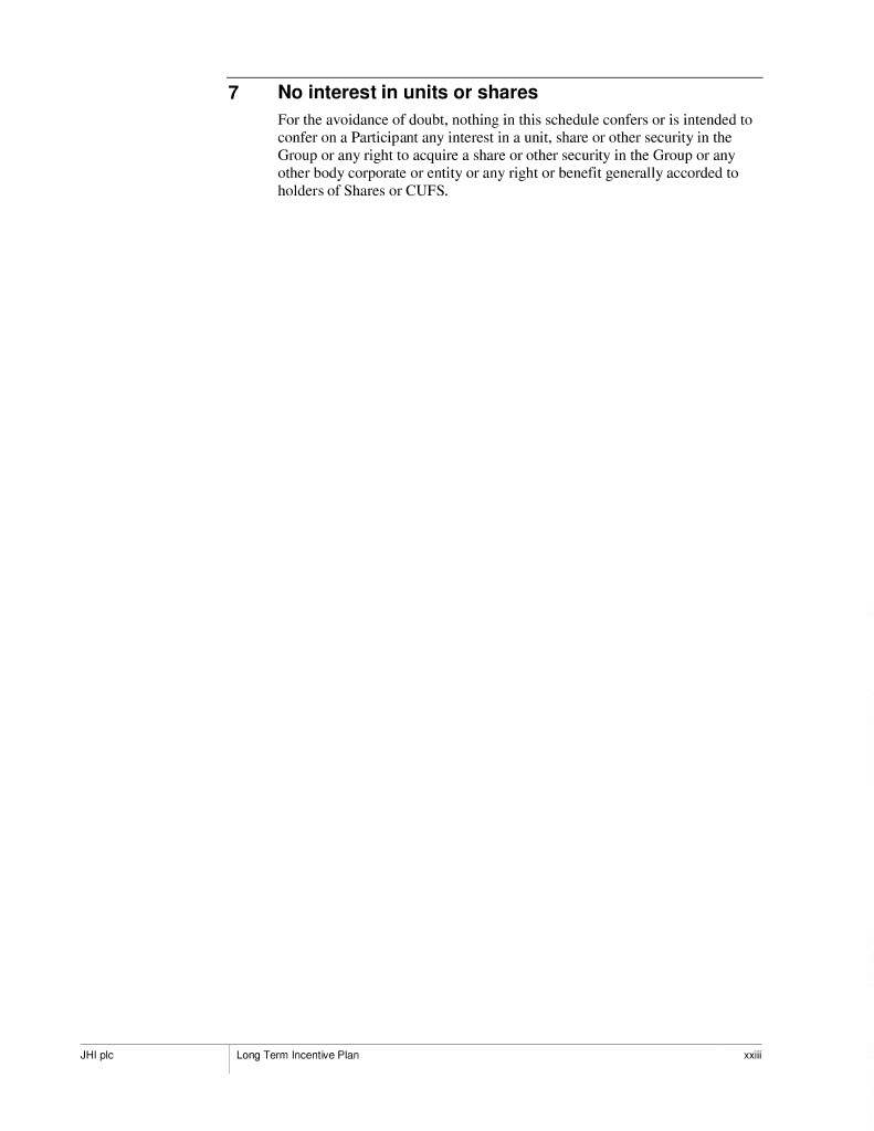 7 No interest in units or shares For the avoidance of doubt, nothing in this schedule confers or is intended to confer on a Participant any interest in a unit, share or other security in the Group or any right to acquire a share or other security in the Group or any other body corporate or entity or any right or benefit generally accorded to holders of Shares or CUFS. JHI plc Long Term Incentive Plan xxiii