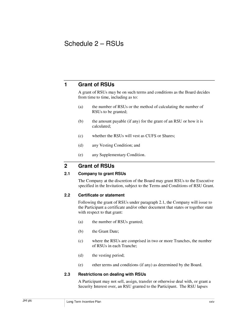 Schedule 2 – RSUs 1 Grant of RSUs A grant of RSUs may be on such terms and conditions as the Board decides from time to time, including as to: (a) the number of RSUs or the method of calculating the number of RSUs to be granted; (b) the amount payable (if any) for the grant of an RSU or how it is calculated; (c) whether the RSUs will vest as CUFS or Shares; (d) any Vesting Condition; and (e) any Supplementary Condition. 2 Grant of RSUs 2.1 Company to grant RSUs The Company at the discretion of the Board may grant RSUs to the Executive specified in the Invitation, subject to the Terms and Conditions of RSU Grant. 2.2 Certificate or statement Following the grant of RSUs under paragraph 2.1, the Company will issue to the Participant a certificate and/or other document that states or together state with respect to that grant: (a) the number of RSUs granted; (b) the Grant Date; (c) where the RSUs are comprised in two or more Tranches, the number of RSUs in each Tranche; (d) the vesting period; (e) other terms and conditions (if any) as determined by the Board. 2.3 Restrictions on dealing with RSUs A Participant may not sell, assign, transfer or otherwise deal with, or grant a Security Interest over, an RSU granted to the Participant. The RSU lapses JHI plc Long Term Incentive Plan xxiv