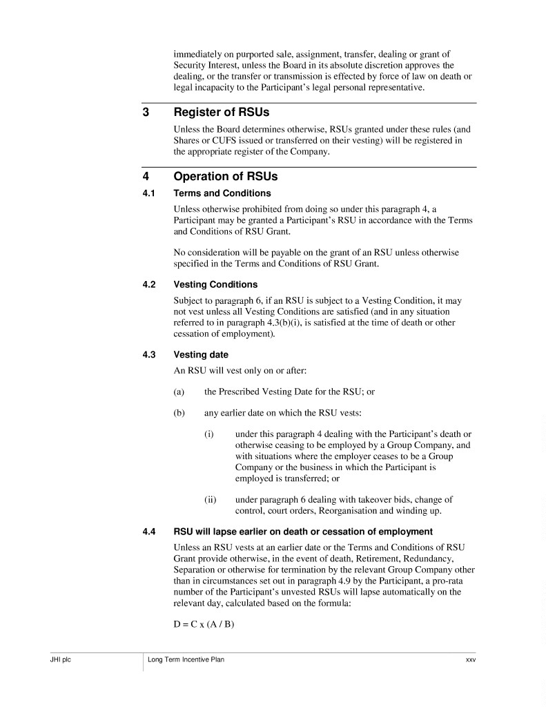immediately on purported sale, assignment, transfer, dealing or grant of Security Interest, unless the Board in its absolute discretion approves the dealing, or the transfer or transmission is effected by force of law on death or legal incapacity to the Participant’s legal personal representative. 3 Register of RSUs Unless the Board determines otherwise, RSUs granted under these rules (and Shares or CUFS issued or transferred on their vesting) will be registered in the appropriate register of the Company. 4 Operation of RSUs 4.1 Terms and Conditions Unless otherwise prohibited from doing so under this paragraph 4, a Participant may be granted a Participant’s RSU in accordance with the Terms and Conditions of RSU Grant. No consideration will be payable on the grant of an RSU unless otherwise specified in the Terms and Conditions of RSU Grant. 4.2 Vesting Conditions Subject to paragraph 6, if an RSU is subject to a Vesting Condition, it may not vest unless all Vesting Conditions are satisfied (and in any situation referred to in paragraph 4.3(b)(i), is satisfied at the time of death or other cessation of employment) . 4.3 Vesting date An RSU will vest only on or after: (a) the Prescribed Vesting Date for the RSU; or (b) any earlier date on which the RSU vests: (i) under this paragraph 4 dealing with the Participant’s death or otherwise ceasing to be employed by a Group Company, and with situations where the employer ceases to be a Group Company or the business in which the Participant is employed is transferred; or (ii) under paragraph 6 dealing with takeover bids, change of control, court orders, Reorganisation and winding up. 4.4 RSU will lapse earlier on death or cessation of employment Unless an RSU vests at an earlier date or the Terms and Conditions of RSU Grant provide otherwise, in the event of death, Retirement, Redundancy, Separation or otherwise for termination by the relevant Group Company other than in circumstances set out in paragraph 4.9 by the Participant, a pro-rata number of the Participant’s unvested RSUs will lapse automatically on the relevant day, calculated based on the formula: D = C x (A / B) JHI plc Long Term Incentive Plan xxv