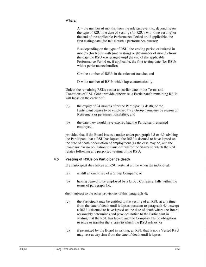 Where: A = the number of months from the relevant event to, depending on the type of RSU, the date of vesting (for RSUs with time vesting) or the end of the applicable Performance Period or, if applicable, the first testing date (for RSUs with a performance hurdle); B = depending on the type of RSU, the vesting period calculated in months (for RSUs with time vesting) or the number of months from the date the RSU was granted until the end of the applicable Performance Period or, if applicable, the first testing date (for RSUs with a performance hurdle); C = the number of RSUs in the relevant tranche; and D = the number of RSUs which lapse automatically. Unless the remaining RSUs vest at an earlier date or the Terms and Conditions of RSU Grant provide otherwise, a Participant’s remaining RSUs will lapse on the earlier of: (a) the expiry of 24 months after the Participant’s death, or the Participant ceases to be employed by a Group Company by reason of Retirement or permanent disability; and (b) the date they would have expired had the Participant remained employed, provided that if the Board issues a notice under paragraph 4.5 or 4.6 advising the Participant that a RSU has lapsed, the RSU is deemed to have lapsed on the date of death or cessation of employment (as the case may be) and the Company has no obligation to issue or transfer the Shares to which the RSU relates following any purported vesting of the RSU. 4.5 Vesting of RSUs on Participant’s death If a Participant dies before an RSU vests, at a time when the individual: (a) is still an employee of a Group Company; or (b) having ceased to be employed by a Group Company, falls within the terms of paragraph 4.6, then (subject to the other provisions of this paragraph 4): (c) the Participant may be entitled to the vesting of an RSU at any time from the date of death until it lapses pursuant to paragraph 4.4, except a RSU is deemed to have lapsed on the date of death where the Board reasonably determines and provides notice to the Participant in writing that the RSU has lapsed and the Company has no obligation to issue or transfer the Shares to which the RSU relates; or (d) if permitted by the Board in writing, an RSU that is not a Vested RSU may vest at any time from the date of death until it lapses. JHI plc Long Term Incentive Plan xxvi