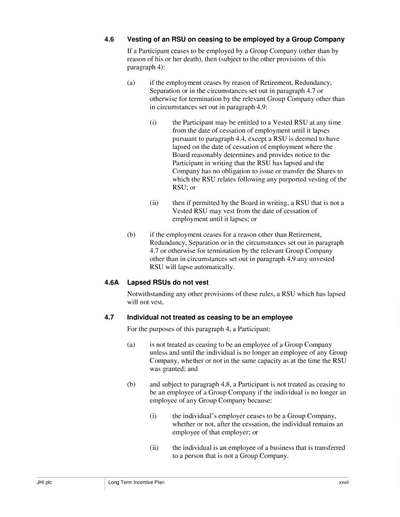 4.6 Vesting of an RSU on ceasing to be employed by a Group Company If a Participant ceases to be employed by a Group Company (other than by reason of his or her death), then (subject to the other provisions of this paragraph 4): (a) if the employment ceases by reason of Retirement, Redundancy, Separation or in the circumstances set out in paragraph 4.7 or otherwise for termination by the relevant Group Company other than in circumstances set out in paragraph 4.9: (i) the Participant may be entitled to a Vested RSU at any time from the date of cessation of employment until it lapses pursuant to paragraph 4.4, except a RSU is deemed to have lapsed on the date of cessation of employment where the Board reasonably determines and provides notice to the Participant in writing that the RSU has lapsed and the Company has no obligation to issue or transfer the Shares to which the RSU relates following any purported vesting of the RSU; or (ii) then if permitted by the Board in writing, a RSU that is not a Vested RSU may vest from the date of cessation of employment until it lapses; or (b) if the employment ceases for a reason other than Retirement, Redundancy, Separation or in the circumstances set out in paragraph 4.7 or otherwise for termination by the relevant Group Company other than in circumstances set out in paragraph 4.9 any unvested RSU will lapse automatically. 4.6A Lapsed RSUs do not vest Notwithstanding any other provisions of these rules, a RSU which has lapsed will not vest. 4.7 Individual not treated as ceasing to be an employee For the purposes of this paragraph 4, a Participant: (a) is not treated as ceasing to be an employee of a Group Company unless and until the individual is no longer an employee of any Group Company, whether or not in the same capacity as at the time the RSU was granted; and (b) and subject to paragraph 4.8, a Participant is not treated as ceasing to be an employee of a Group Company if the individual is no longer an employee of any Group Company because: (i) the individual’s employer ceases to be a Group Company, whether or not, after the cessation, the individual remains an employee of that employer; or (ii) the individual is an employee of a business that is transferred to a person that is not a Group Company. JHI plc Long Term Incentive Plan xxvii